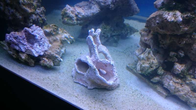 Dekorationen består af 3 stk. Atoll nano-søjler, 1 stk. JJ reef-cave og 1 stk. JJ nano-søjle. JJ nano-søjlen har jeg delt og limet den ene del på en af Atoll-søjlerne, så den danner en bro med en af de andre nano-søjler, hvis de bliver rykket sammen. På skillevæggen ind til sumpen "svæver" 2 stk. Magnetic Reef Shelfs fra The alternative Reef.