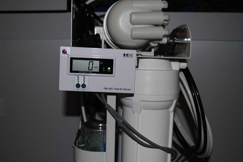 Jeg har et Sirius 500GD osmoseanlæg, hvor jeg har sat et ½ liters fyldbar harpiksfilter fast på stellet med et 2,5" clip vægbeslag. Harpiksfilteret hænger lodret, da det er bedst pga. flowet igennem filteret. Før og efter harpiksfilteret har jeg monteret en DM-2EC dobbelt µS monitor. Osmoseanlægget er stripset fast på et lille DIY-bord med fire ben og hjul på, så jeg kan rulle det ud i køkkenet, når der skal laves vand.