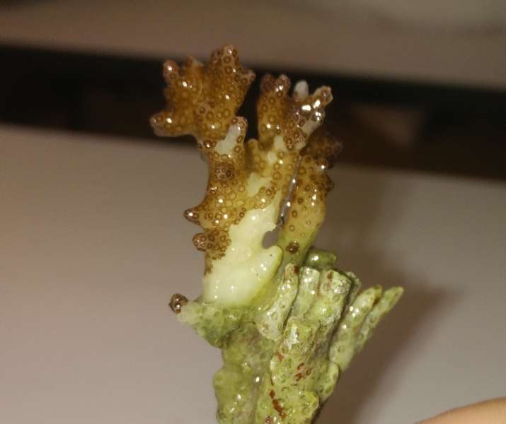 Ift. små lokale døde områder og zooxantheller, så er jeg ikke i tvivl om at det er hele vævet der mangler, ikke bare blegning ved at korallerne har udstødt deres symbionter.