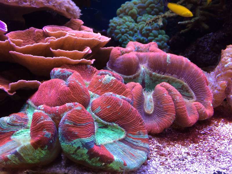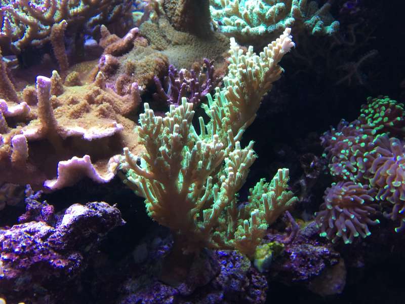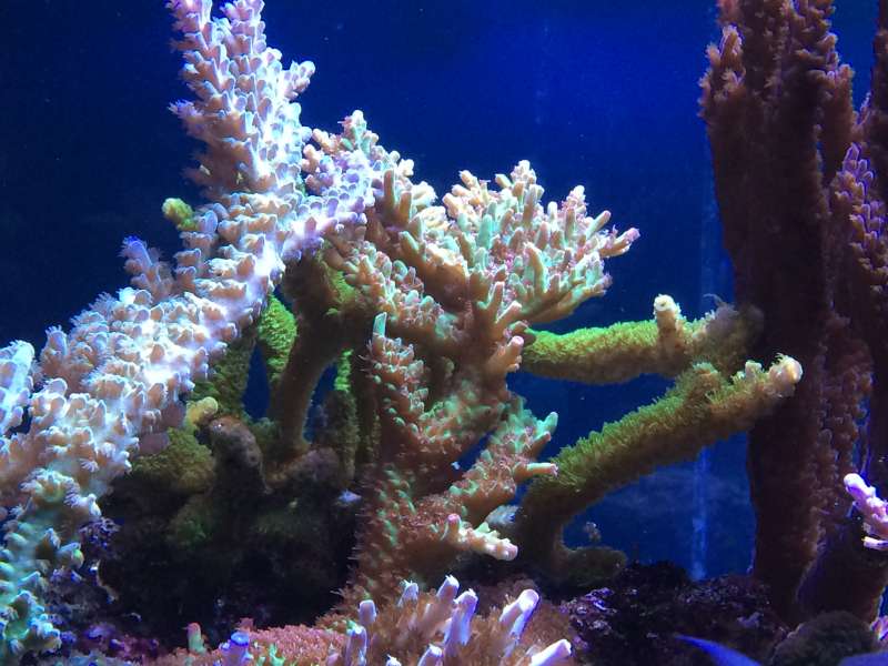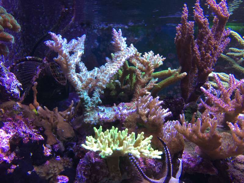 Af levende sten har jeg ca 150kg i akvariet. set i bakspejlet har jeg lidt fortrudt jeg ikke lavet det mere åbent i form for nogle fede søjler, men det må blive en anden gang. Nok en af de største fejl jeg gjorde da jeg lagde det om til koraller igen var ikke og skifte bundlaget, bundlaget har været igennem meget, da jeg havde fisk, så mistænker det for at og indeholde meget skidt, nok også derfor jeg ikke kan slippe helt af med cyano på bunden, også selv om jeg har suget det ud og skyllet det kommer cyano tilbage, så det må nok heller skifte på et tidspunkt.