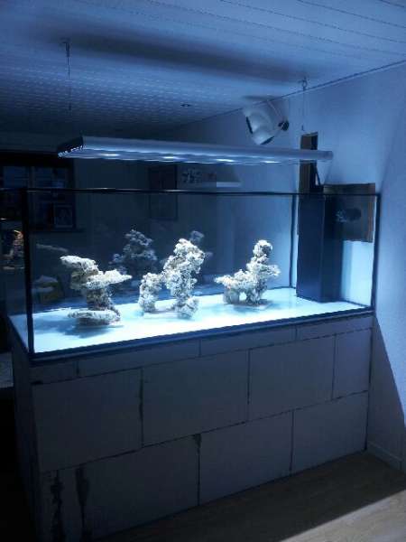 Jeg fik mit display lavet så stort som overhovedet muligt hos Claus fra Tropeakvarier. Den mand har virkelig styr på det at lave akvarier. Størrelsen var begrænset af muligheden for at få det ind i huset. Hvis det havde været meget større, så skulle det have været limet på stedet, da det skulle stå som en rumdeler imellem køkkenalrum og stue. Selve akvariet måler L200 x D80 x H70 cm = 1120 liter. Totalt fra gulv til loft. Det er fremstillet i Weiss-glas på de to langsider samt på ende siden ude i rummet. Overløbet er lavet midt på den korte ende ind mod muren. Fik også lavet en stor lampekasse, i hvid foamalux, med skydelåger, som passer til stilen i resten af huset. Jeg fik åbnet op ned til betongulvet og bygget soklen af betonblokke, så jeg var sikker på det kunne klare den enorme vægt. Derefter blev soklen beklædt med klippeagtige sten for at gøre den pæn at se på.