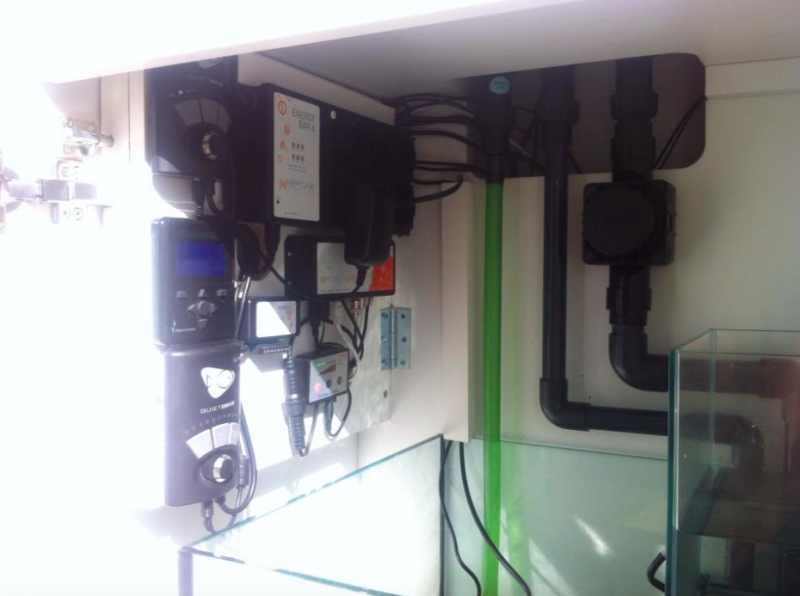I sumpen har jeg fået monteret skummerens controller på teknikpladen og sat ledningen op med de andre. Nu mangler jeg, stadig, bare doseringsmaskinen. Jeg bliver ved med at udskyde det da jeg endnu ikke har fundet den perfekte løsning på alle slangerne, der skal løbe til og fra den. Doseringsbeholderne skal stå til venstre for sumpen.