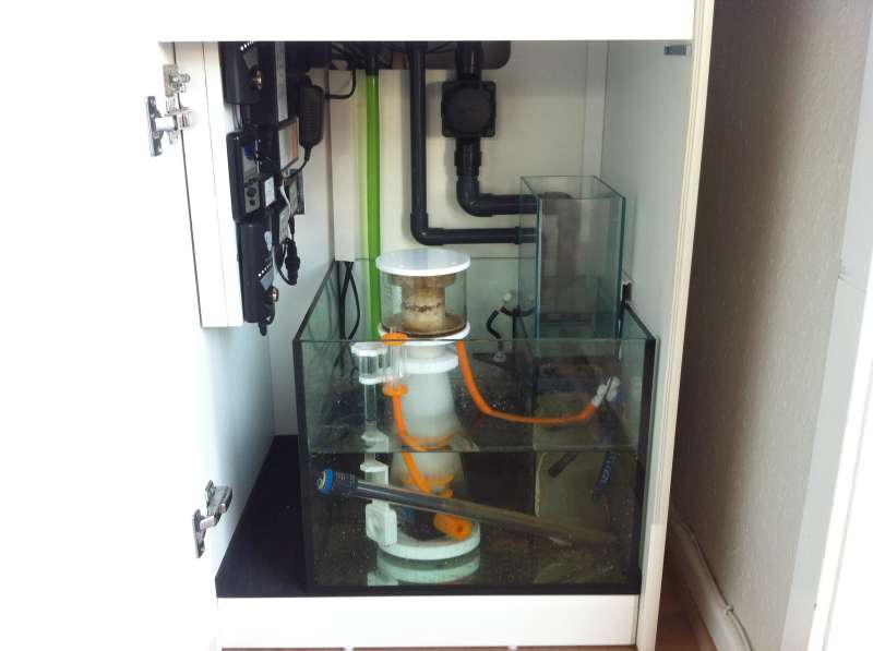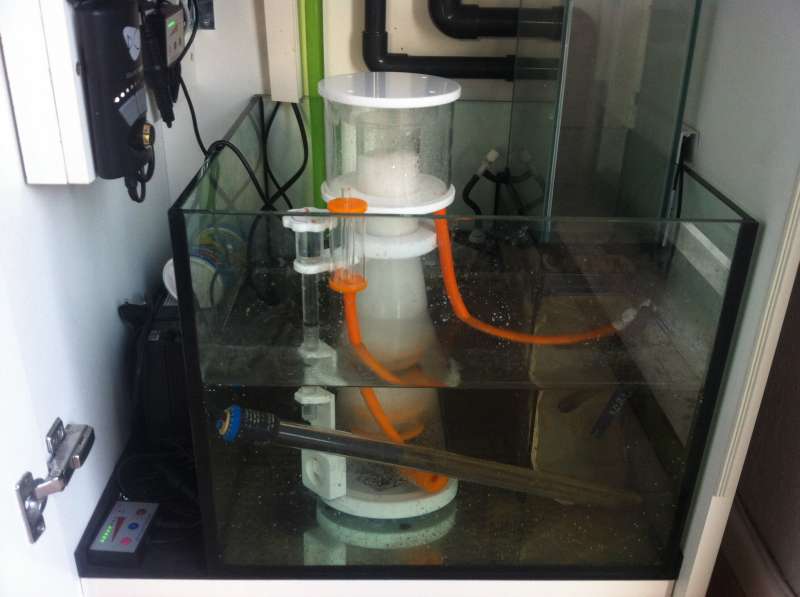 Så kom der skummer på systemet. Det blev til en Coral Box D300 købt som xx skummer hos Decocean. Dvs. under et andet navn. Men det er bare en Coral Box med nyt klistermærke. Den starte med at være så stille som en skummer kan være, men så tog fanden ved den, hvorefter den begyndte at larme. Efter at have skilt den ad 4-5 gange er den atter stille og jeg afventer om det forbliver sådan. Lige nu tegner det lovende. Faktisk kan man næsten ikke høre den når skabet er lukket. Og hvor ER det bare (sarte sjæle bedes forlade tråden nu) PISSE FUCKING FOR NICE TOP LÆKKERT SVEDIGT !!!!! Jeg har ventet på denne dag i flere ÅR !! :D ENDELIG en skummer, der næsten ikke høres. Jeg kan slet ikke få hænderne ned. Nu skal doseringsmaskinen bare sættes op en af dagene og så er systemet så færdigt som et akvarie med tilhørende teknik nu kan blive. Der er jo altid plads til forbedringer. Men for pokker hvor er det fedt. Jeg glæder mig fortsat til at kunne hente de sidste fisk hos Jesper. Og så kan jeg jo overveje om der er plads til en enkelt lille fisk derefter. Liste over udstyr og levende bliver løbende opdateret i trådens første indlæg.
