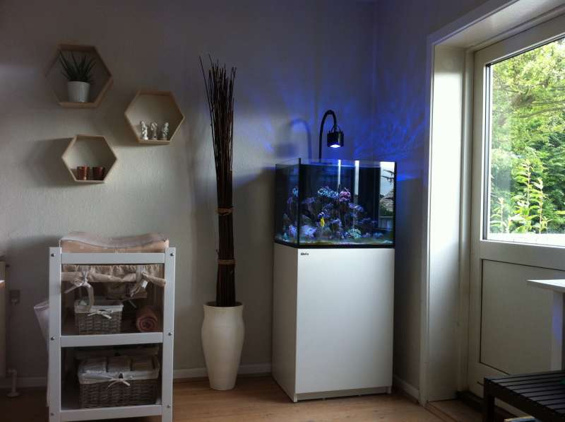 En lille detalje er, at hvis man ser godt efter på det senest tilføjede billede vil man opdage, at der ikke tilgår nogle kabler til akvariet. Det gør der selvfølgelig, men de er fastmonteret langs panelerne på gulvet, så de ikke ses. En lækker detalje er at jeg har opsat Apex med netkabel, som løber under panelet foran døren til haven. Derved opnår jeg den bedst mulige netforbindelse. Faktisk har der ikke været problemer siden jeg gik over til kabel. Men det skyldes nok nærmere en dårlig wififorbindelse i huset, sådan helt generelt. Slutteligt har jeg brugt sorte strips til ledningerne på Kessil lampen, så de ikke bare hænger og ser trælse ud.