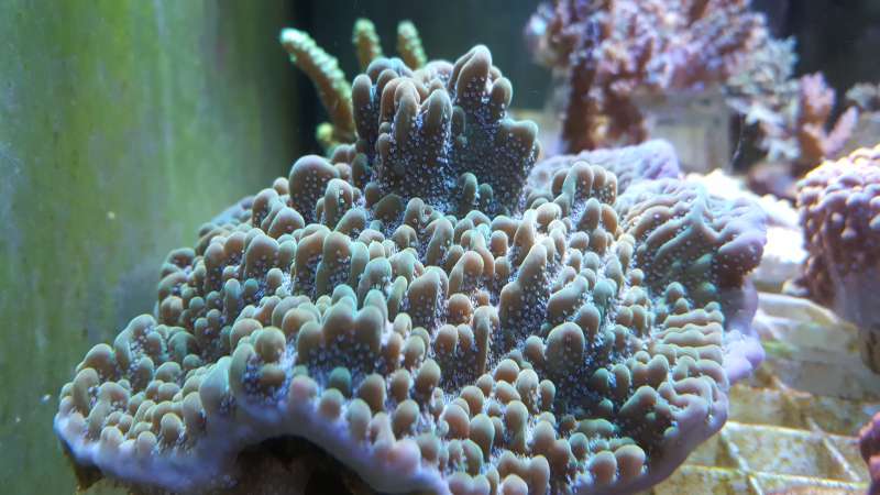 Jeg fik min sammen med to andre US-koraller i foråret/tidlig sommer 2014. Den ene, en Montipora ”appleberry”, mistede jeg desværre i forbindelse med mine jod ubalance problemer. Den var ellers begyndt at vokse fint, men brød sig ikke så meget om den konstante påvirkning fra både algerne jeg kæmpede med og børsten jeg brugte til at fjerne algerne med.