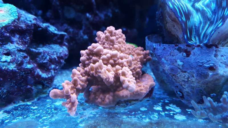 Det er en meget voksevillig koral og den er nem at fragmentere med en Dremmel. Jeg har flere fragmenter stående, som jeg eksperimenterer lidt med. Jeg afprøver forskellige lys- og strøm forhold.