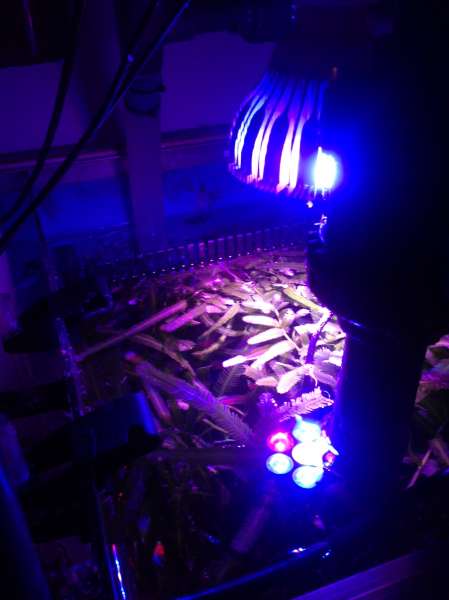Der fulgte en Maxspect Razor 420 160W lampe med akvariet, og jeg har skiftet linserne til 120 grader. Herudover har jeg monteret et T5 rør og en LED-stang på hver side af lampen. Jeg overvejer en spot på et par af korallerne, det er svært at dække et overfladeareal på 0,8 m2 med én maxspect og et par rør.