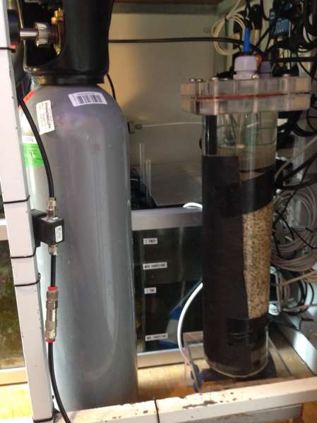 En JJ reaktor med en lille Eheim-pumpe bliver fodret fra returen via et t-stykke. I reaktoren sidder en pH-probe, som fortæller computeren, hvornår den skal give strøm til en magnetventil, der så åbner og lukker for CO2-tilførslen (6 kg) til reaktoren. Et ret klassisk setup som jeg alligevel gerne vil have ændret til i stedet at måle på udgangsvandet, da jeg så vil kunne tage højde for, hvor meget medie der er tilbage i reaktoren, men det har jeg til gode. Udløbet fra reaktoren går i skummeren via en nåleventil med et forfilter a’la Gnizten's Jeg lukker 80 ml ud i minuttet, og jeg holder en pH værdi i reaktoren på lige under 7,00.