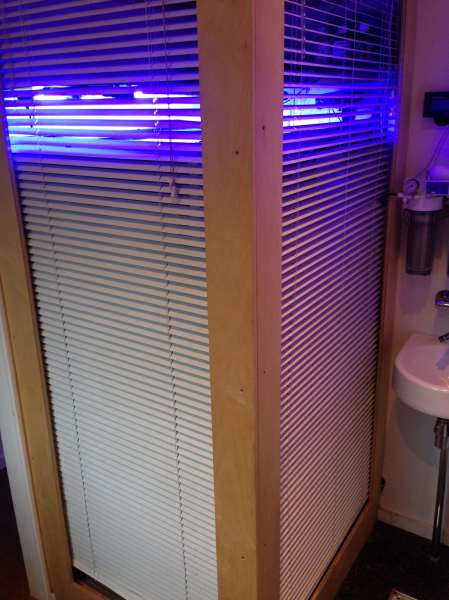 Sumpen er et gammelt udstillingsakvarium fra Planteimporten på 150 liter. L85 x D50 x H35 cm. Jeg har et ferskvandskammer i den ene side på ca. 25 liter. Det rækker til 5-6 dage. To tredjedele af vandet fra DT løber til skummerkammeret som også huser varmelegeme, redox- og pH-prober. Resten af vandet løber i et refugium med sandbund, levende sten og Caulerpa alger. Algerne er belyst om natten af en plante-lampe, og deres primære funktion er nærringseksport. Jeg høster et par gode håndfulde ca. en gang om måneden. Én gang har jeg prøvet, at de groede for tæt og blev hvide. Jeg opdagede det ved hvidligt vand sammen med et heftigt pH-drop. Vandet fra både refugium og skummerkammer (via bobbelfælde) løber til returkammeret.