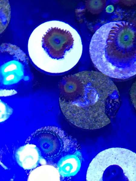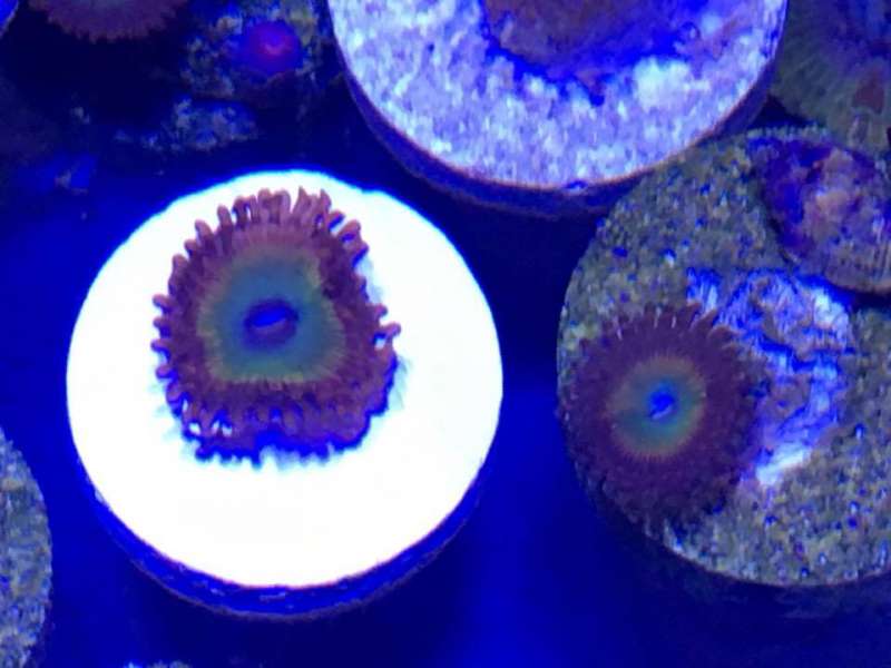 This Zoanthid forms clumped colonies of polyps with short tentacles. They are found in shallow areas where there is high water movement. Their colors are varied. The oral disc is generally a different color than the "skirt", and even a third color can form in the very center, almost like a pupil.