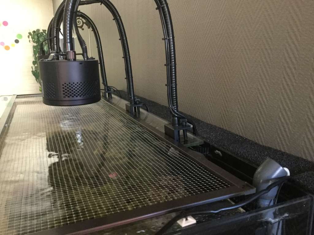 Af belysning over akvariet vil jeg fortsætte med at bruge Kessil-lamper med deres monterings-kit, og netop omkring monteringen af disse lamper vil jeg gerne have at de fastgøres på akvariet. På mit nuværende akvarie sidder lamperne på den vandrette bølgebryder på bagruden. Dette kunne jeg godt bruge nogle ideer til hvordan de evt. vil kunne fastgøres på en anden og bedre måde. Jeg går selv med en ide om at påmontere et stykke glas hele vejen langs bølgebryder/bagruden i lodret, dog er jeg meget i tvivl om dette vil kunne holde? (Se billede af nuværende akvarie)