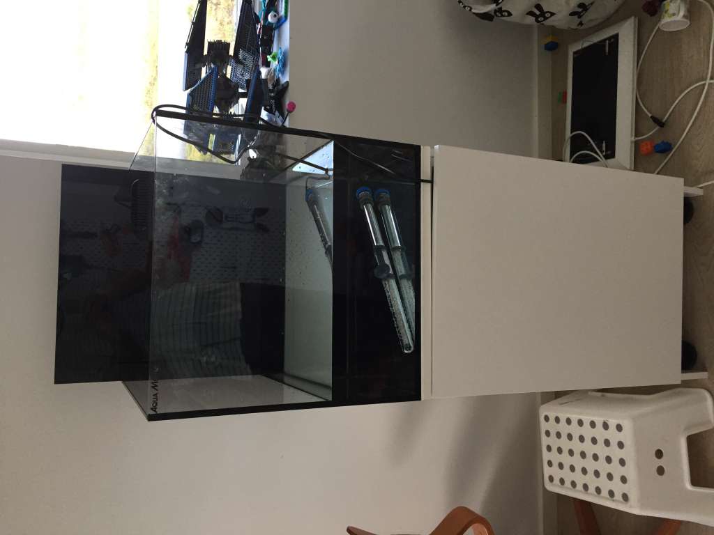 Akvariet er et Aqua medic cubicus, og kan forhåbentlig stille mine abstinenser ift. noget større, som nok må vente lidt tid endnu... desværre. Egentligt et tilfælde jeg er endt med dette akvarium, men det har en fin størrelse og passer fint ind på hans værelse. Har ellers altid haft den holdning, at akvarier under 250 liter skulle jeg aldrig eje - og da slet ikke et cube-formet!!!!