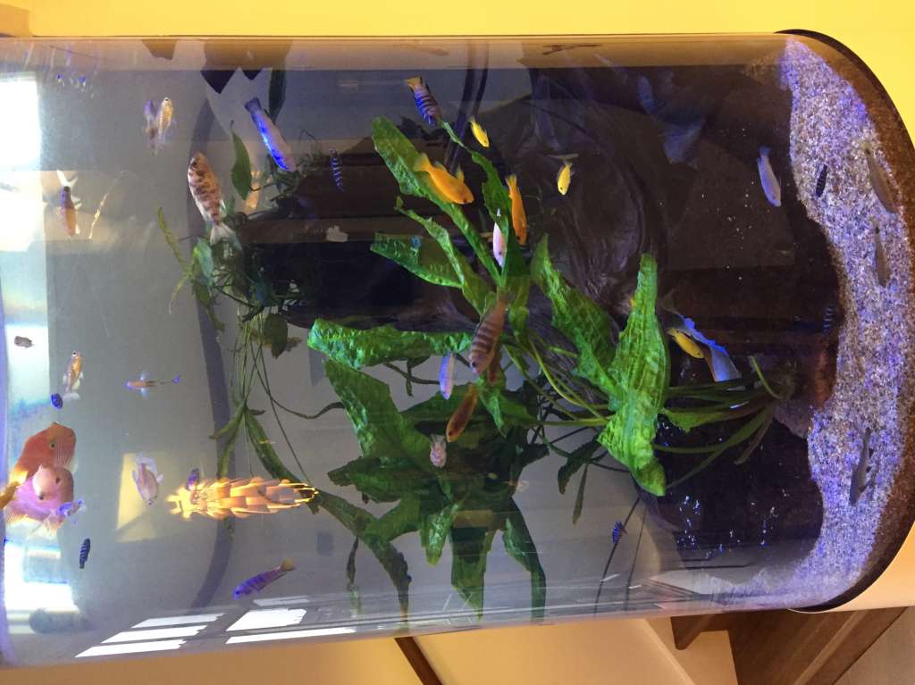Her er min kammerats akvarie, det måler 100cm i diameter og 150 i højden. Pris 40 store lapper derudover fragt fra Australien plus kranløft til 4 sal som kostede stort set det samme som akvariet. Bare den specielle algemagnet som er formet efter efter bugningen på akvariet koster kr. 3000,- Så ja det er dyrt :dizzy: