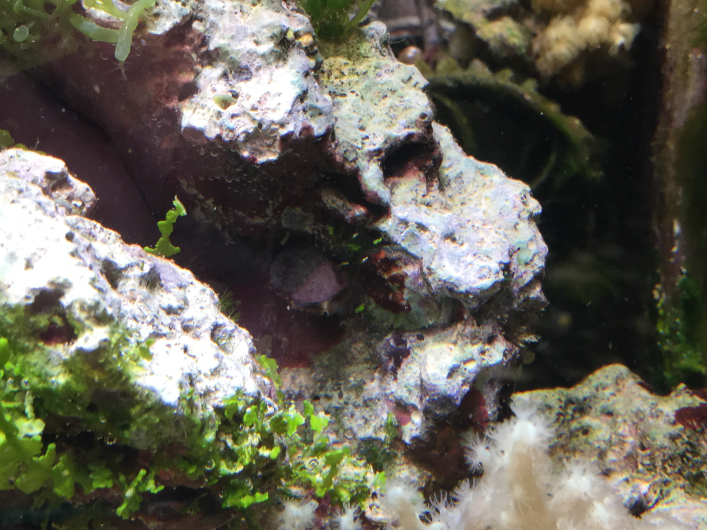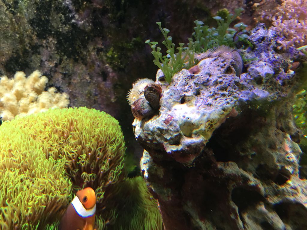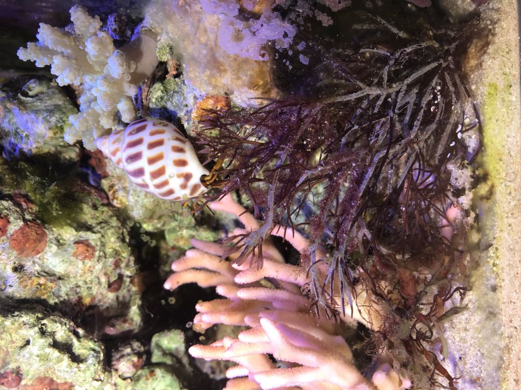 et billede af den lille klump tang, scooter blenny kan anes i bunden og der er faktisk 2 erimitkrebs som kravler rundt omkring det, selv om det kun er den ene man lige umildbart kan se på billedet.