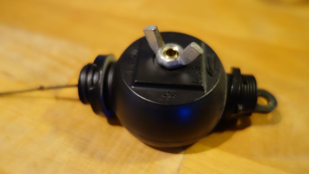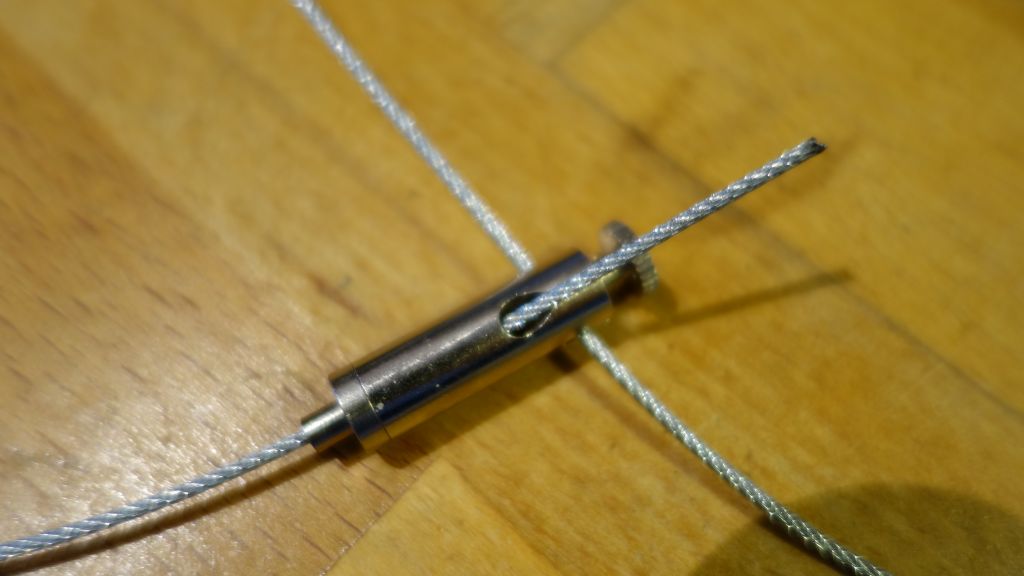 Den nye lampe vejer imidlertid 10 kg., som er i overkanten for taljerne. Jeg har købt original Giesemann wire til ophæng, men jeg er usikker på hvor let det er i praksis at hejse lampen op og især ned under kontrollerede forhold - den skal ikke hamre i akvariet! Man skal med en negl trykke på splitten for at wiren løber frit ned.