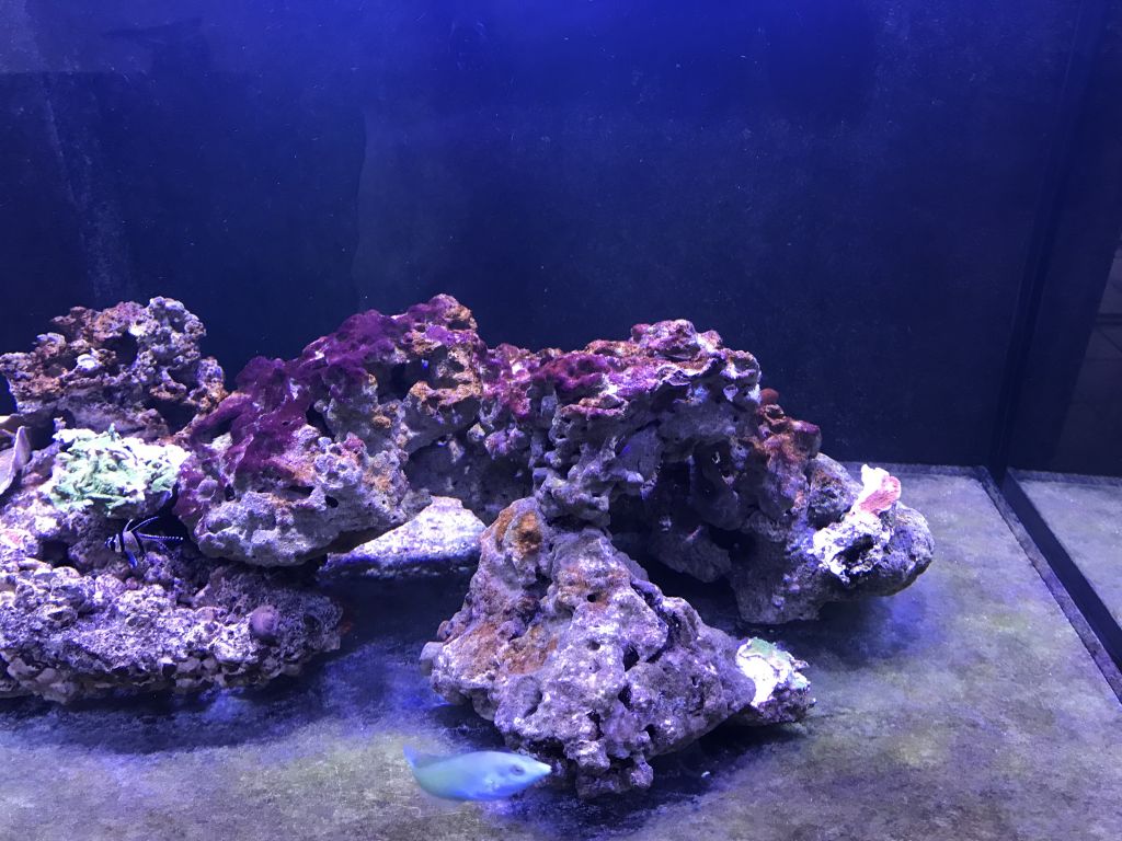 Hejsa. Mit akvarie har nu kørt nogle mdr og har lidt cyano på stenene ( se foto 3+4 foroven på stenene ) Jeg har fået lidt koraller, en hammerkoral og lidt forskellige montipora fragmenter, er ikke begyndt med dossering endnu, vil køre med aquaforest 3 væsker ( balling) Vil tro at no4 værdien kommer fra fodring med nori tang. Mine Gyre 350 sidder af hensyn til udseende på bagvæggen, foto 1 - kører gyre mode fra +10 til +60 %, ville de give bedre flow i enderne ?