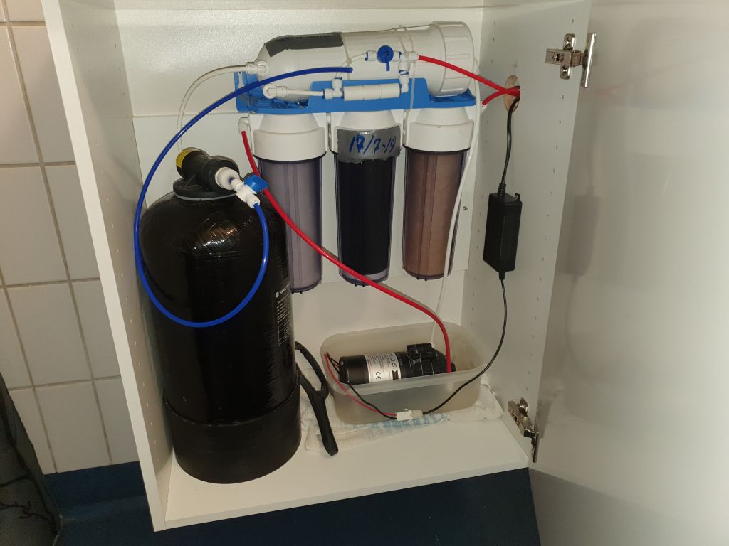 Omvendt osmose: 300 GPD membran, 3 trins filtre med boosterpumpe og et 11 liters silikatfilter- laver 50 liter i timen med en spildvandsfaktor 1:2 og en TDS på 0.