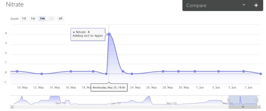 Det er selvfølgelig et ungt system jeg har, men jeg har masser af vækst på mine sps. Det som bekymre mig, er at have så lavt NO3 over lang periode(Se fig.1) pludselig ikke har NO3 i systemet, især hvis jeg ikke er hjemme i en periode. Har dog læst på R2R at lav næring + Høj KH giver SPS vækst og højer næring og lavere KH skulle give farve