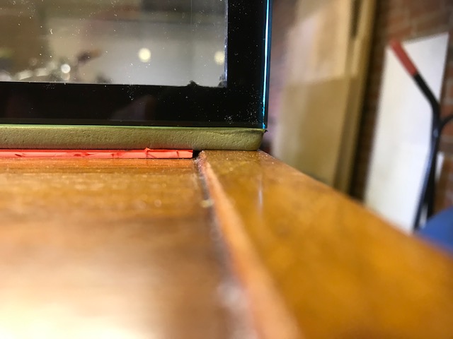 Jeg har skåret et stykke plast til (den røde plade) for at udjævne foreskellen, og der er lagt et 6mm liggeunderlag mellem.