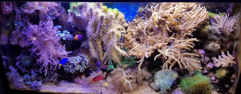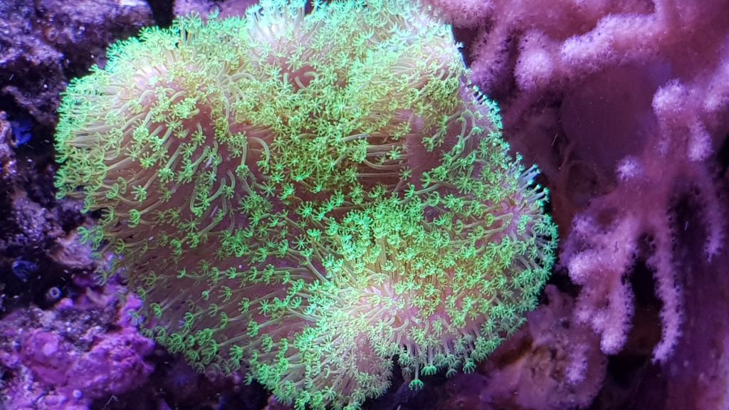 De fleste af de koraller jeg har, blev anskaffet i 2014. Enkelte er endnu ældre. I gennem tiden er nogle døde, mens andre breder sig uhæmmet. Hos mig hersker der lidt naturlig selektion. Jeg havde for eksempel temmelig mange Rhodactis-skiveanemoner, som næsten dækkede stenene i højre side. Igennem de sidste to år er min grønlige Sinularia-blødkoral vokset så kraftigt til, at skiverne er blevet skygget delvist væk.