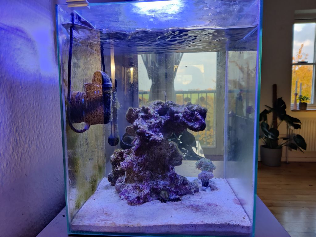 Akvariet kører uden skummer, i stedet får jeg næring ud af akvariet via ugentlig vandskifte, som samtidig holder de andre værdier på plads. Pt. skifter jeg fem liter om ugen, ud af en samlet vandmængde i akvariet på 22L - altså knap 25% vandskifte om ugen. I fremtiden vil jeg måske hæve det til at skifte 10L om ugen, men for nu ser 5L ud til at være fint, men det kommer nok, når koralsamlingen bliver udvidet fra to Euphylliaer, som udgør koralbesætningen lige nu, samt hvad jeg tror, er en blåmusling, som jeg havde på en af stenene fra det gamle setup, der nu har hæftet sig fast på søjlen i nanoakvariet. Foruden vandskifte, så doserer jeg MicroBacter7 hver uge efter vandskifte ifølge instruktionerne på flasken - så 12 dråber om ugen.