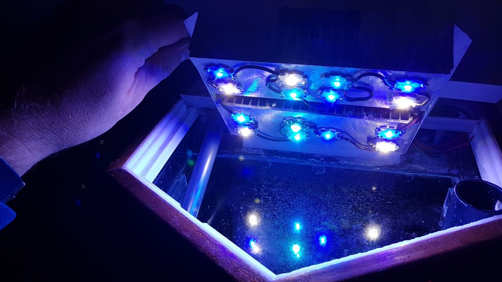 I toppen er der plads til en DIY Led-lampe med 10 blå led og 5 hvide, der kan justeres i lysstyrke. Jeg har en Coral Box Moon Led liggende som reserve, og den passer perfekt i rammen.