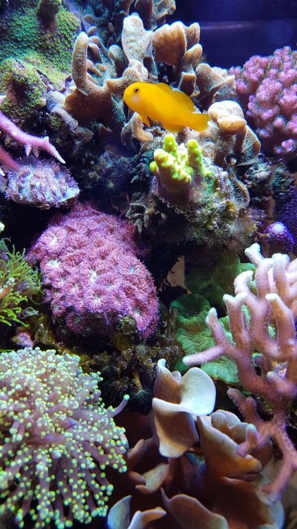 Ja, størrelsen sætter jo visse begrænsninger. Ud over muslingen, som trives nu på 5. år er der en håndfuld sexy-shrimps og så har jeg forsøgt mig med en lille gul goby. Den kan nemlig finde nok mad i stensætningen, så jeg ikke behøver at fodre. Fodring er No-Go i så lille et system uden skummer og andre dikkedarer.