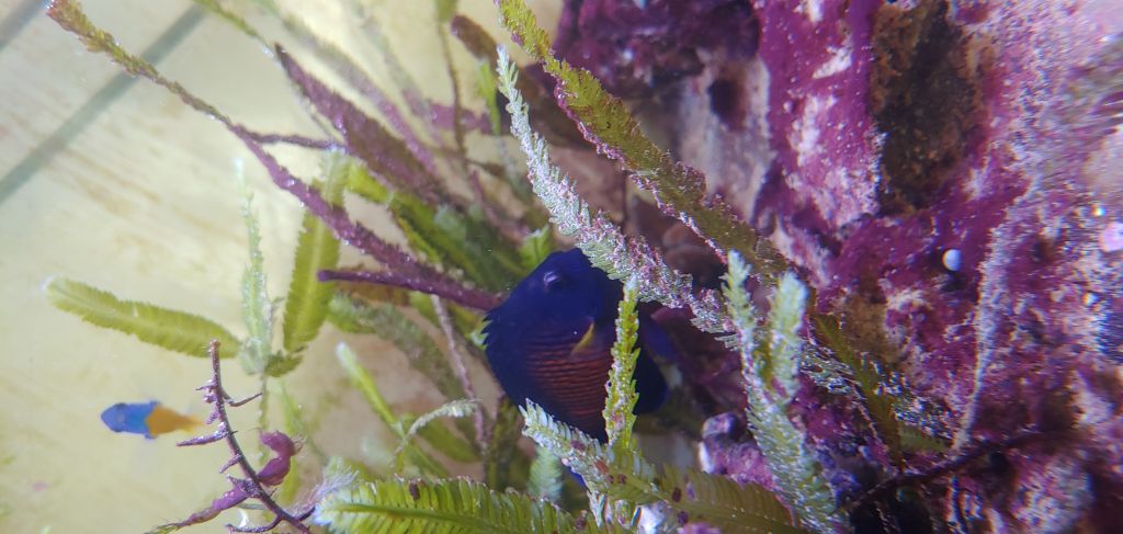 Mit karantæne akvarie er på 128liter, har en lille skummer, varme, en halv gyre pumpe, og 5W UV, ved godt det er meget lille, men kører med lavt flow.