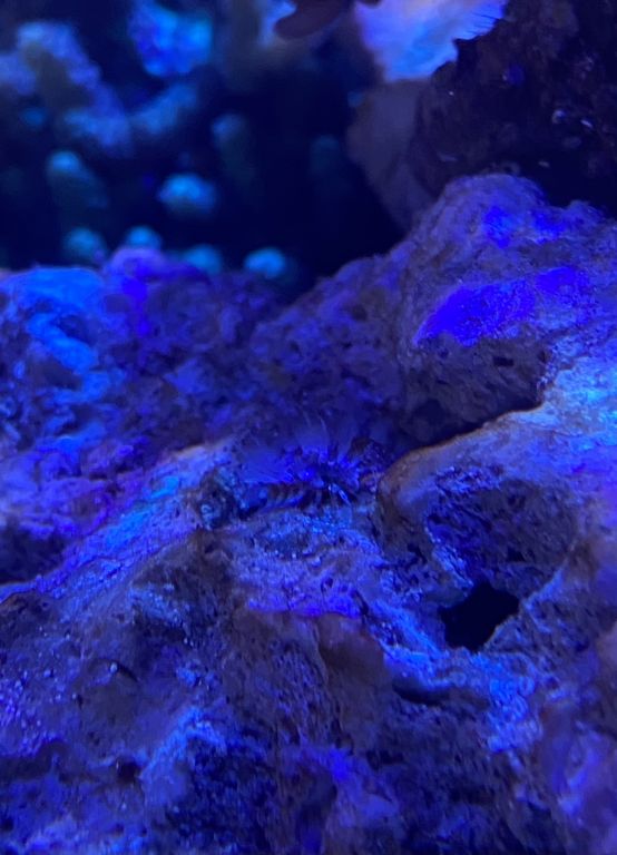 Hvad er dette jeg har fået i min balje, har fået et hurtigt glimt af den et par gangen, men her sidste dag noget jeg enlig at få taget billede af den og den er vokset siden jeg så den sidst, hvad er det og er det noget der kan skade mine koraler/fisk?