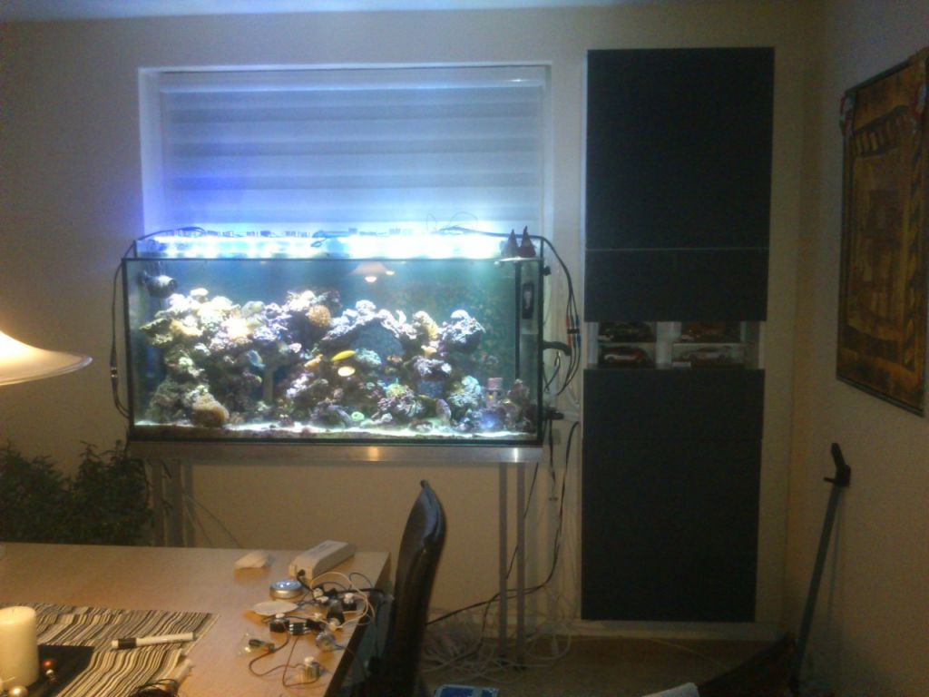 Det gik rigtig fint i starten. Det meste af mit gamle udstyr var solgt, og der var kommet meget nyt, og bedre, grej til på bare de 2-3 år, jeg var væk. Så lidt nyt blev indkøbt og testet af. Mine koraller voksede ikke helt som tidligere og som forventet. Mere vil hurtigt have mere, og et akvarie blev til 2, så 3 og 4, og de blev ombygget et efter et med fælles sump. Det forårsagede selvfølgelig at min plan heller ikke holdt en meter længere. Der blev også indkøbt lidt dyre koraller igen og lidt for mange fisk. De daglige vandskift kunne slet ikke tilføre det, som der var behov for og heller ikke holde NO3 og Po4 nede = igen en kamp. Nu med dyre koraller som gik til igen, og mistrives i de perioder jeg havde travlt. Godmorgen min bare r.v - efter et år havde jeg 3 stk. 113 l liters kørende, brugt en masse penge på udstyr og koraller endnu en gang, og var næsten havnet i samme situation som før, nu også med en baby på armen og tidsmangel.