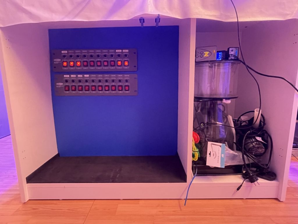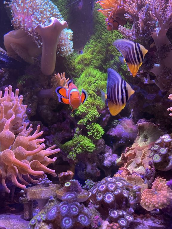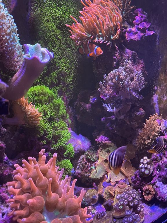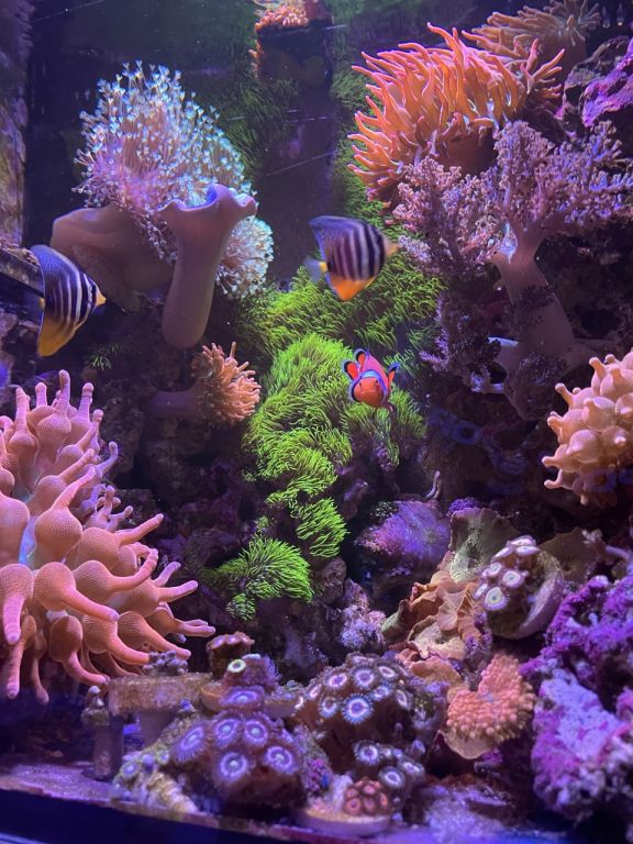 Hurtigt fik vi indbygget det lækre akvarie i stuen og fyldt discus i. Til stor fornøjelse og glæde for alle, samt pengepungen. Det har vi den dag i dag stadig med Discus og lidt småfisk. I et par år havde vi stadig 3-4 forskellige akvarier kørende med en Axolotl (salamander), Moskusskildpadder, Cichlider og havedam med forskelligt. Fine farver og forskelligartet bevægelse og en gave til børn der bare elsker det. Så jeg var uden saltvand i et par år, og på trods af at jeg havde besluttet aldrig mere saltvand. Så manglede der noget, og min kone blev gravid i 2018. Så tænkte jeg, vores lille pige skal sku ikke vokse op uden et akvarie med et par klovnefisk.