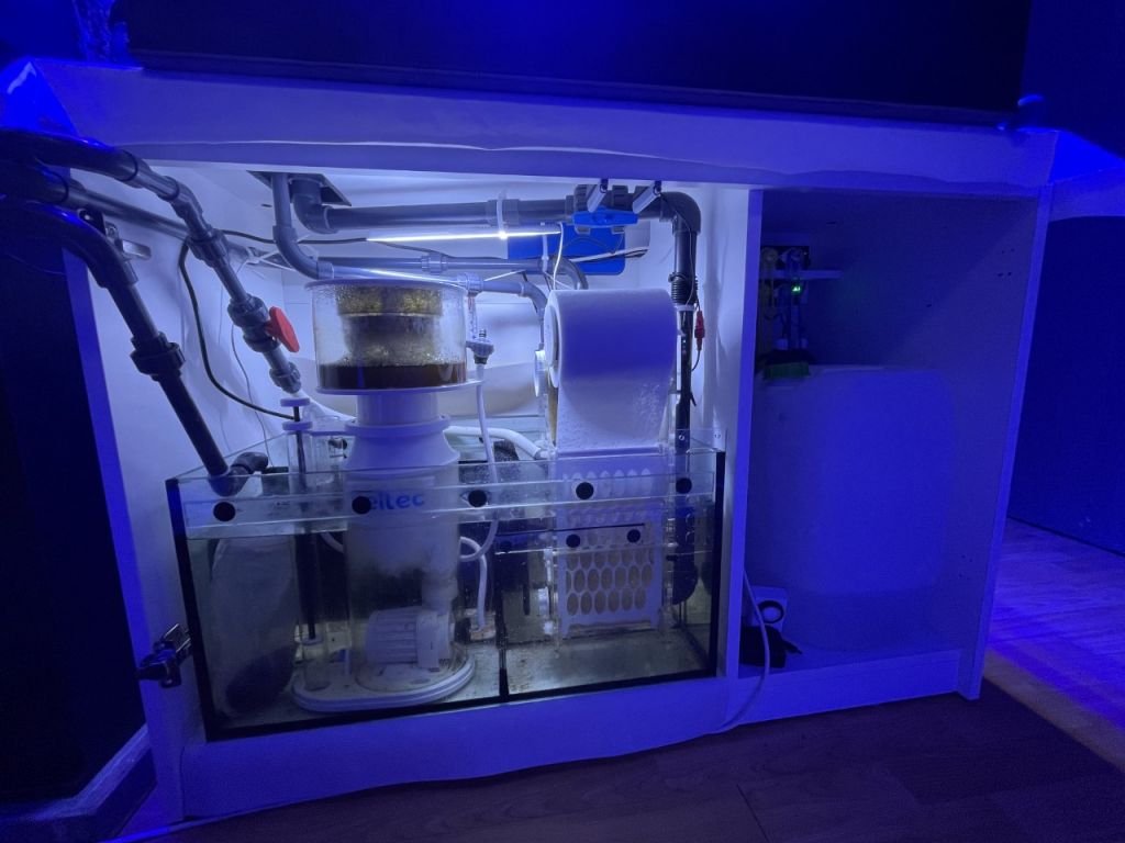 Sumpen er et standart Red Sea Reefer sump, som følger med til mit kommende Red Sea Reefer 350, og som er ombygget til plads til skummer og rullefilter samt vandrotation til chaetoalger, og måler L70 x D43 x H35 cm.