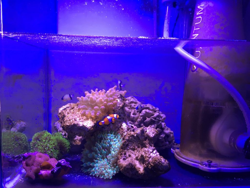 Hurtigt fik vi indbygget det lækre akvarie i stuen og fyldt discus i. Til stor fornøjelse og glæde for alle, samt pengepungen. Det har vi den dag i dag stadig med Discus og lidt småfisk. I et par år havde vi stadig 3-4 forskellige akvarier kørende med en Axolotl (salamander), Moskusskildpadder, Cichlider og havedam med forskelligt. Fine farver og forskelligartet bevægelse og en gave til børn der bare elsker det. Så jeg var uden saltvand i et par år, og på trods af at jeg havde besluttet aldrig mere saltvand. Så manglede der noget, og min kone blev gravid i 2018. Så tænkte jeg, vores lille pige skal sku ikke vokse op uden et akvarie med et par klovnefisk.