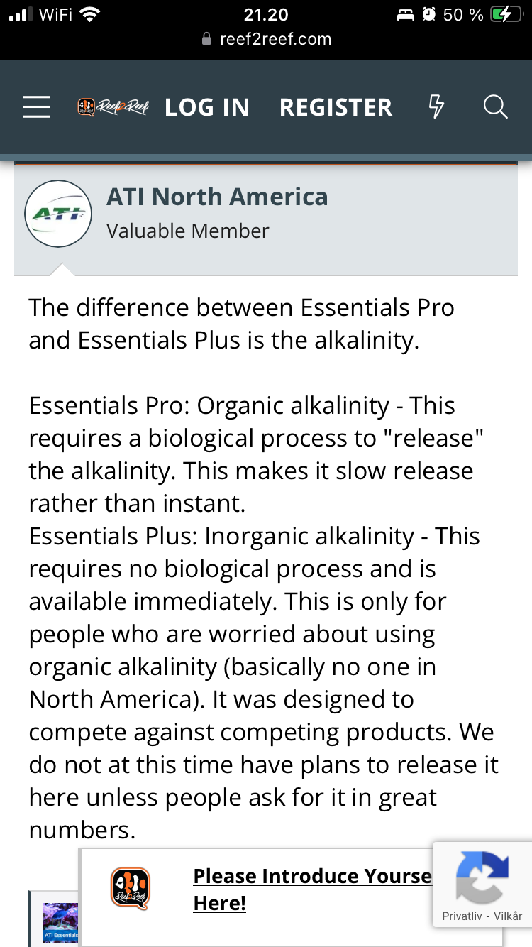 Kan se på ATIs hjemmeside: https://atiaquaristik.com/de/?page_id=6438" onclick="window.open(this.href);return false;, at Essentials+ er bedre til SPS+LPS dominerede akvarier. Måske det er årsagen til at jeg kom i bund med sporstoffer. Så jeg laver et skift og vil prøve med Essentials+, håber det bliver godt.