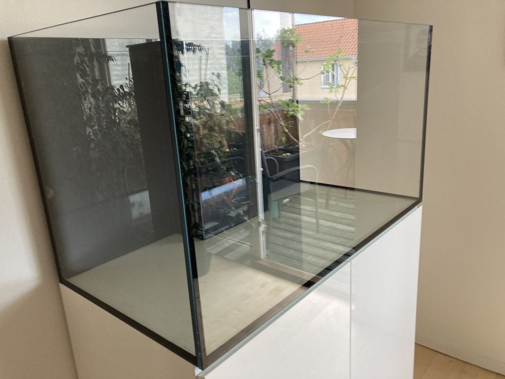 Forrige ejer har passet godt på akvariet. Der er ikke antydninger af ridser i glasset. Alt fremstår som nyt efter en grundig rengøring.