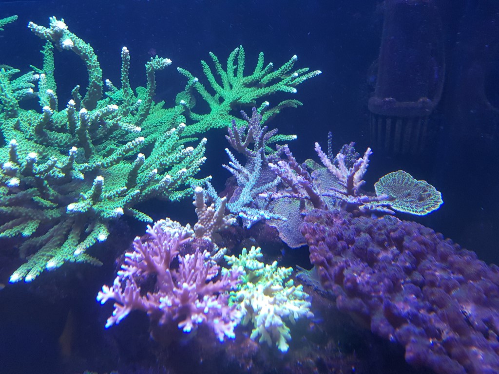 Mange forskellige, lps, sps og blødkoraller. mange store gamle kolonier som jeg ved tåler udsving i næringsindhold. Største lige pt. er en bali slimer acro på 45 x 30 x 20 cm. Tungeste er uden tvivl en turbinaria peltata som jeg fik af Thomas klokker fra Fyn for nogle år siden. Fisk
