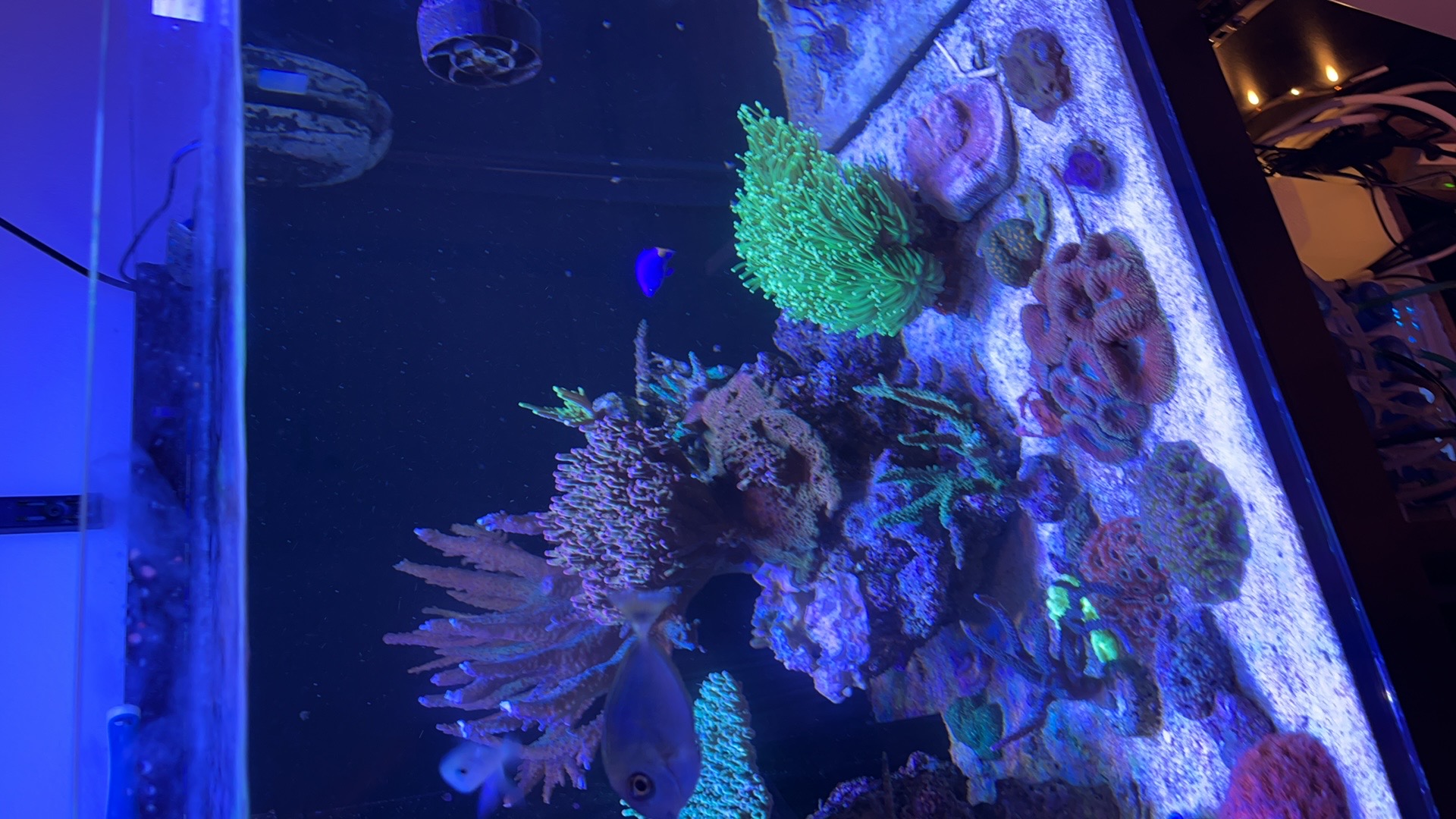 Lige nu er der et rollerfilter, en red sea 900 skummer, lille uv og et lille filter med rowamedie. Og idag har jeg fået tilsat ozon.