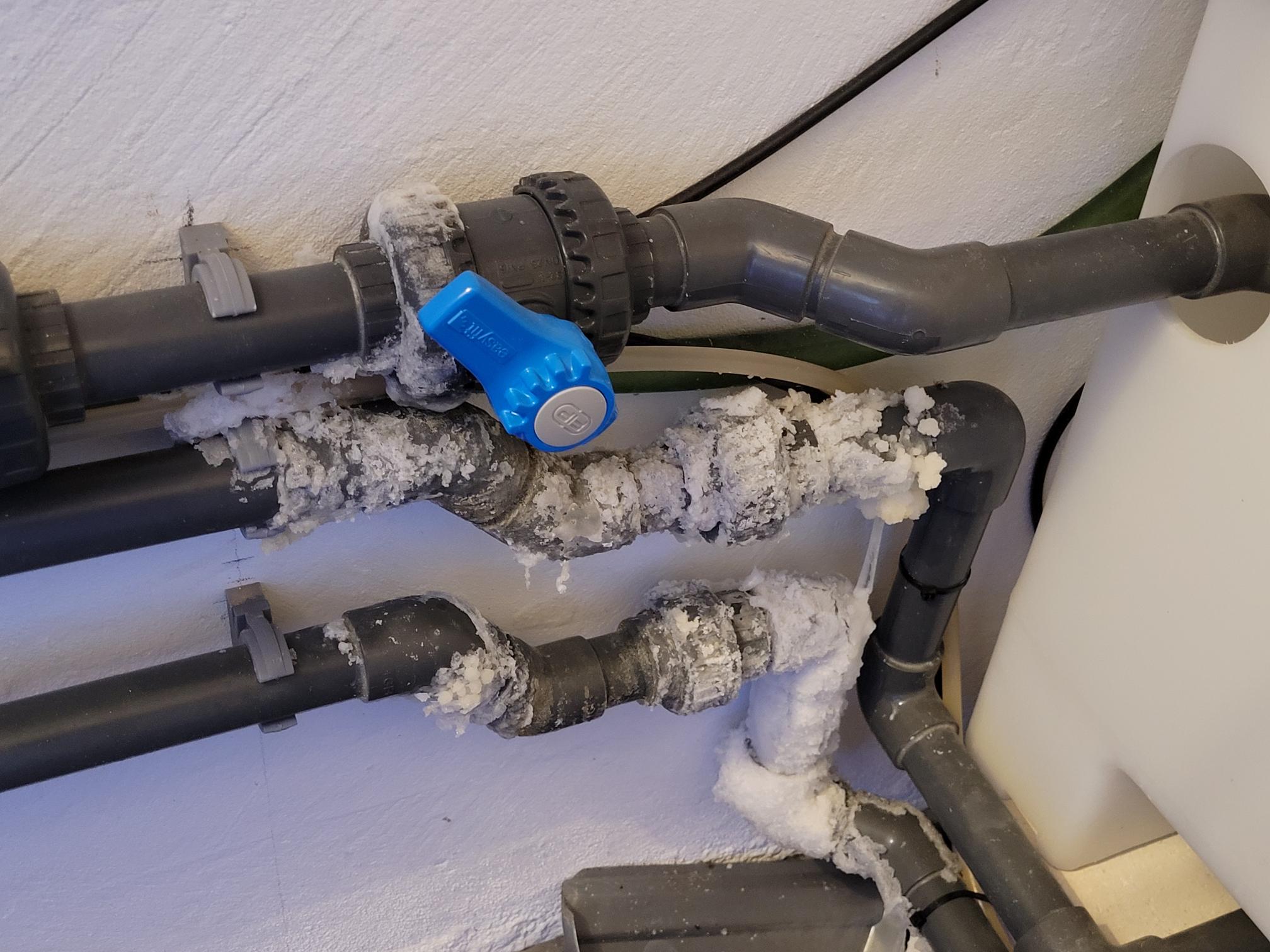 Et lille tip: Har du kuglehaner som du bruger til at regulere flowet, så luk dem helt op og massér dem lidt fra tid til anden mens flowet løber frit igennem. Når en kuglehane er skruet ned, så sætter der sig slam og detritus på bagsiden af kuglen. Hvis ikke man får det fjernet løbende, så kan det opbygges og det har man ikke kontrol over. En fuld åbning af hanen vil skylle det ud. Nå, men jeg havde altså to steder på rørføringen, hvor der var en del saltkryb. Begge steder sidder der kuglehaner og på det ene sted er den reguleret. Det så farligt ud, så jeg besluttede mig at gøre noget ved det.