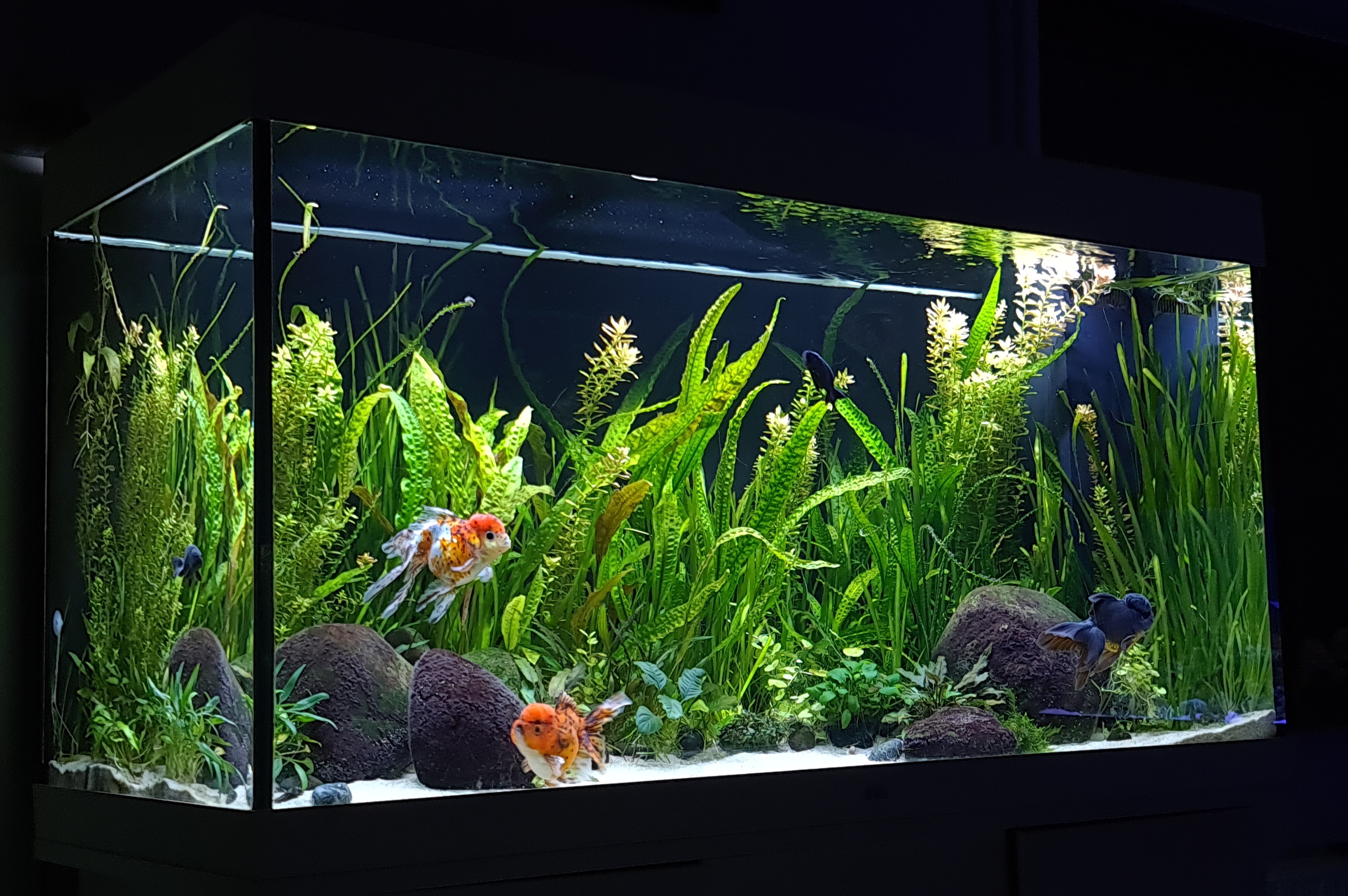 Dyr: 3 store Oranda, 2 små Ranchu, 2 hillstream loach samt 150 Neocaridina rejer.