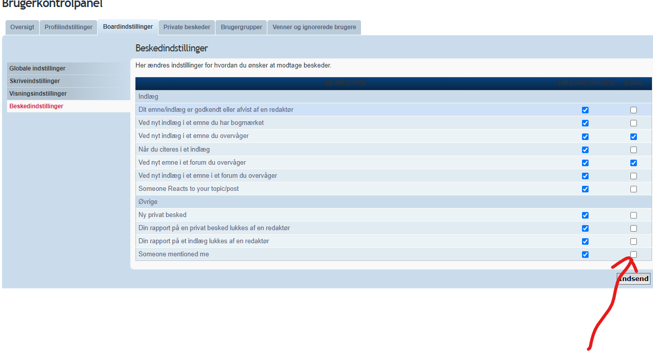 Din profil er automatisk indstillet til at få besked via en notifikation, men ønsker du også at få en mail om at du er blevet nævnt på sf, kan du vinge det af i dine profilindstillinger, som du tilgår ved at trykke på dit profilnavn i øverste højre hjørne på siden.