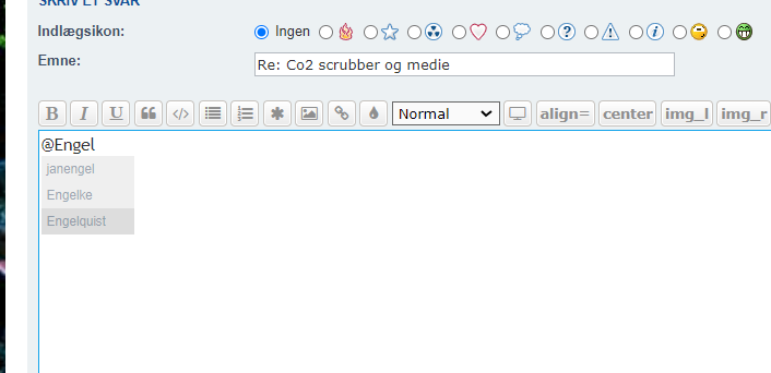 Vælg komplet skrivefelt: Skriv @ og brugernavn (uden mellemrum) og vælg brugeren i forslagsboksen Tryk gem og brugeren du har nævnt står med rødt og får en notifikation. Din profil er automatisk indstillet til at få besked via en notifikation, men ønsker du også at få en mail om at du er blevet nævnt på sf, kan du vinge det af i dine profilindstillinger, som du tilgår ved at trykke på dit profilnavn i øverste højre hjørne på siden.