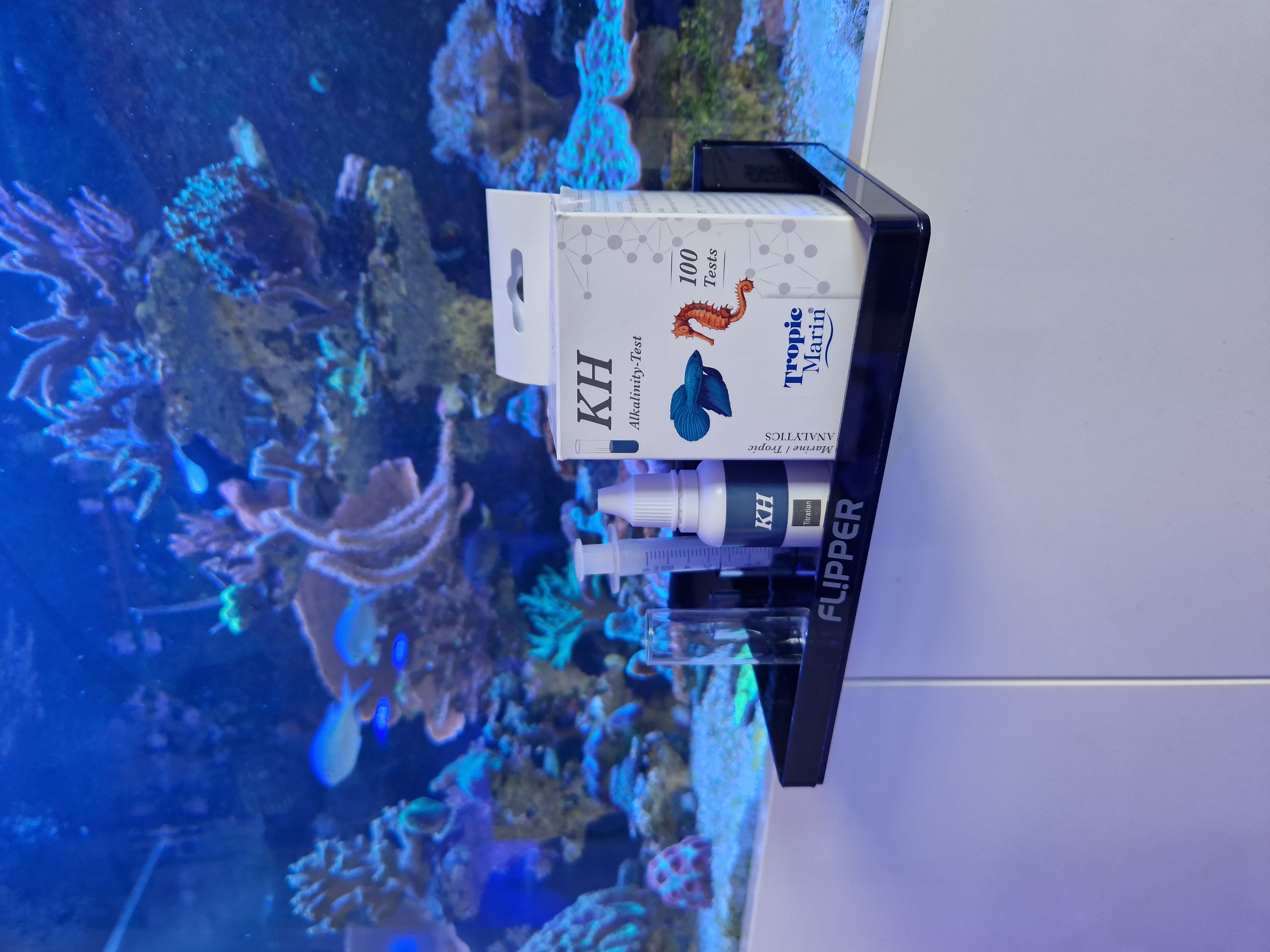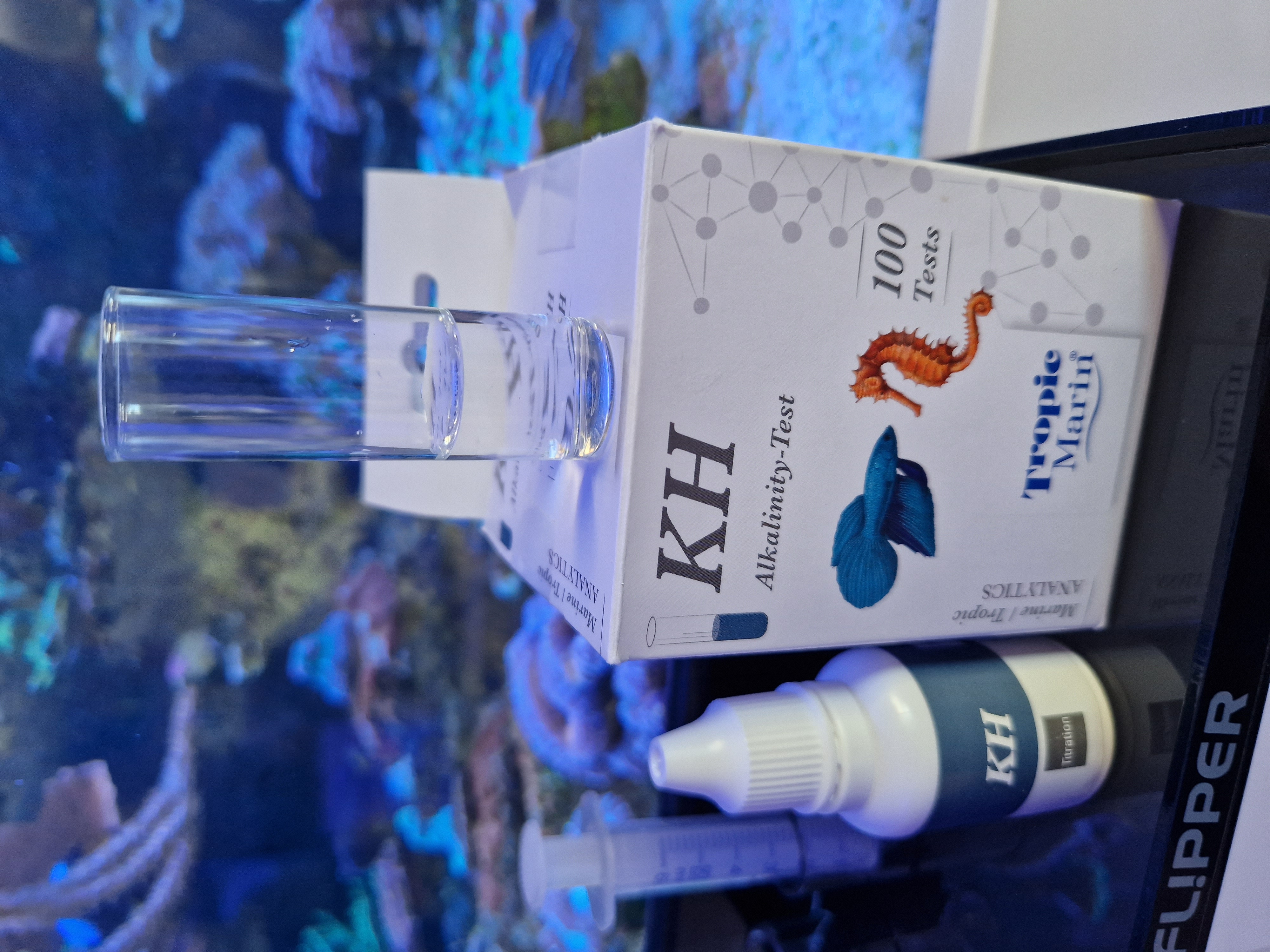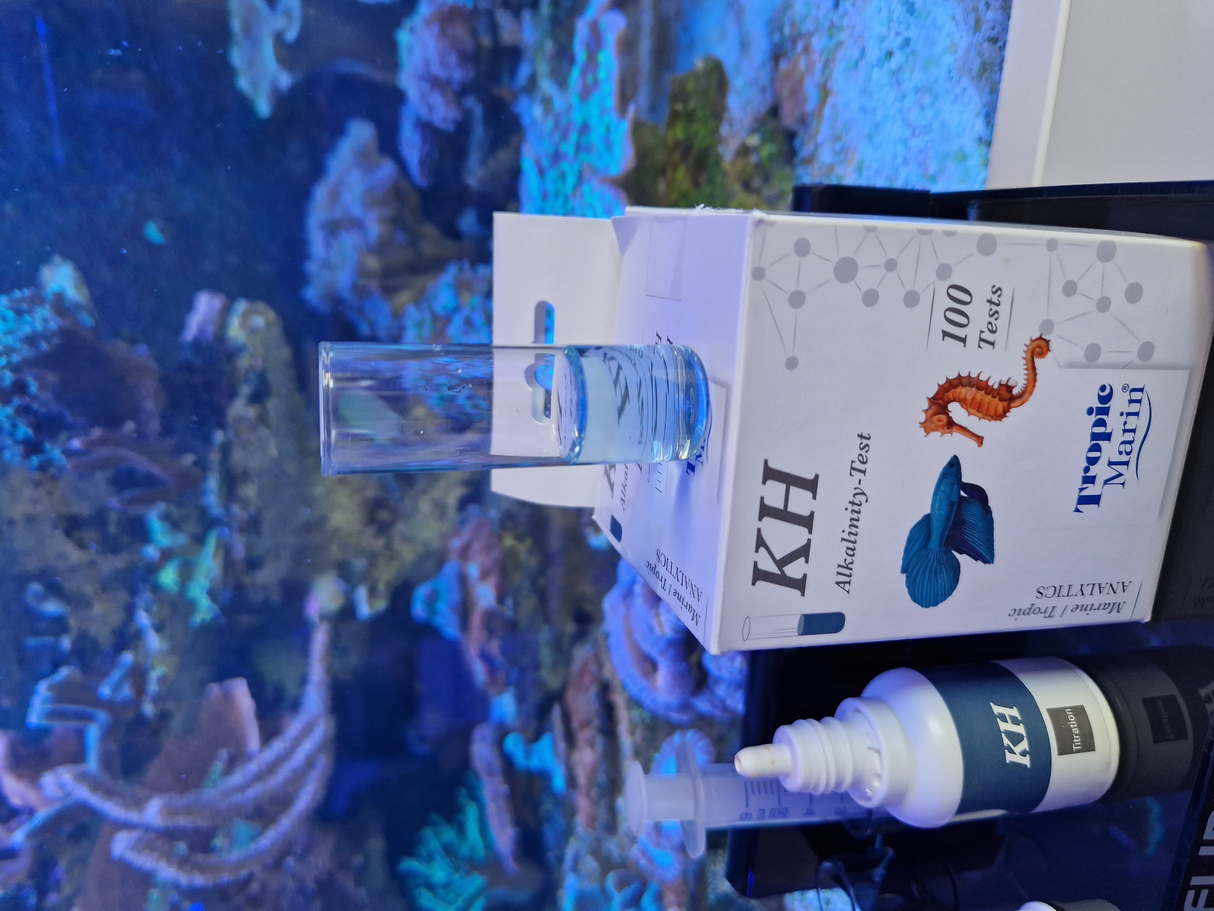 Den første test er vores "normale" KH test. Det er en titrationstest med kun én væske. Der skal ikke dryppes noget farve i først, det gør den meget nem og hurtig at bruge.