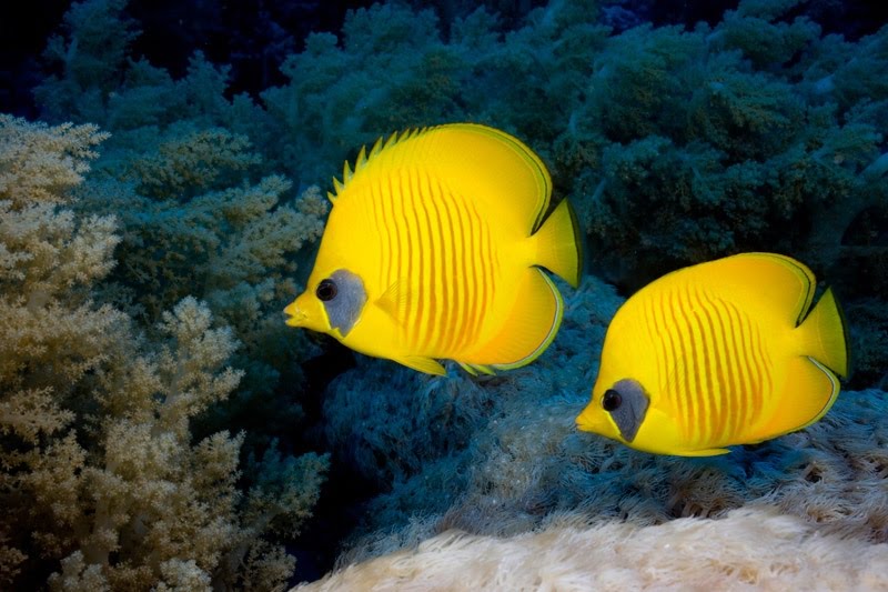 Den Chaetondon er jo for det meste gul. Jeg har en Chaetodon kleinii og den er også gul. Har lidt farve på finnerne. Ganske køn faktisk.