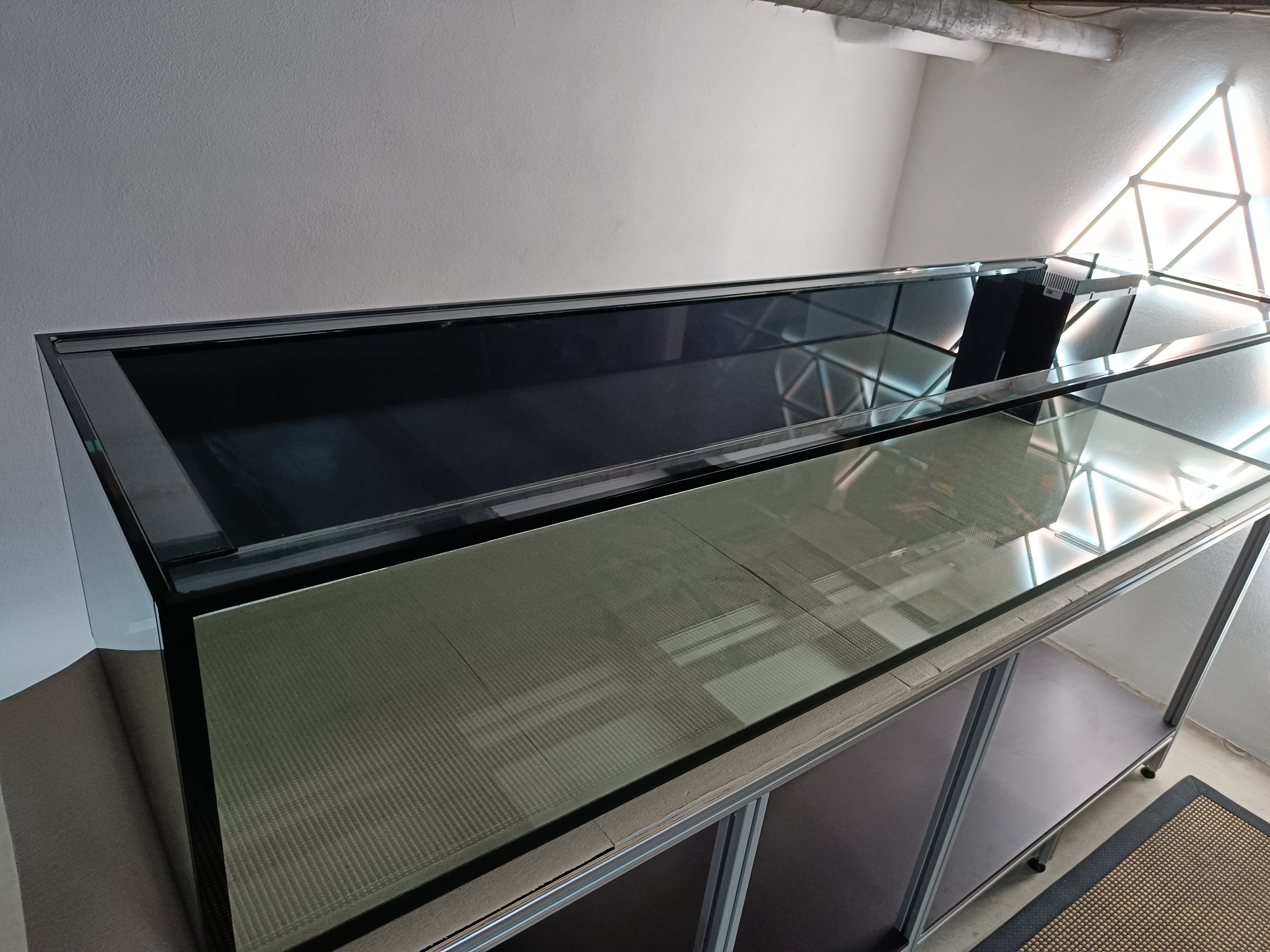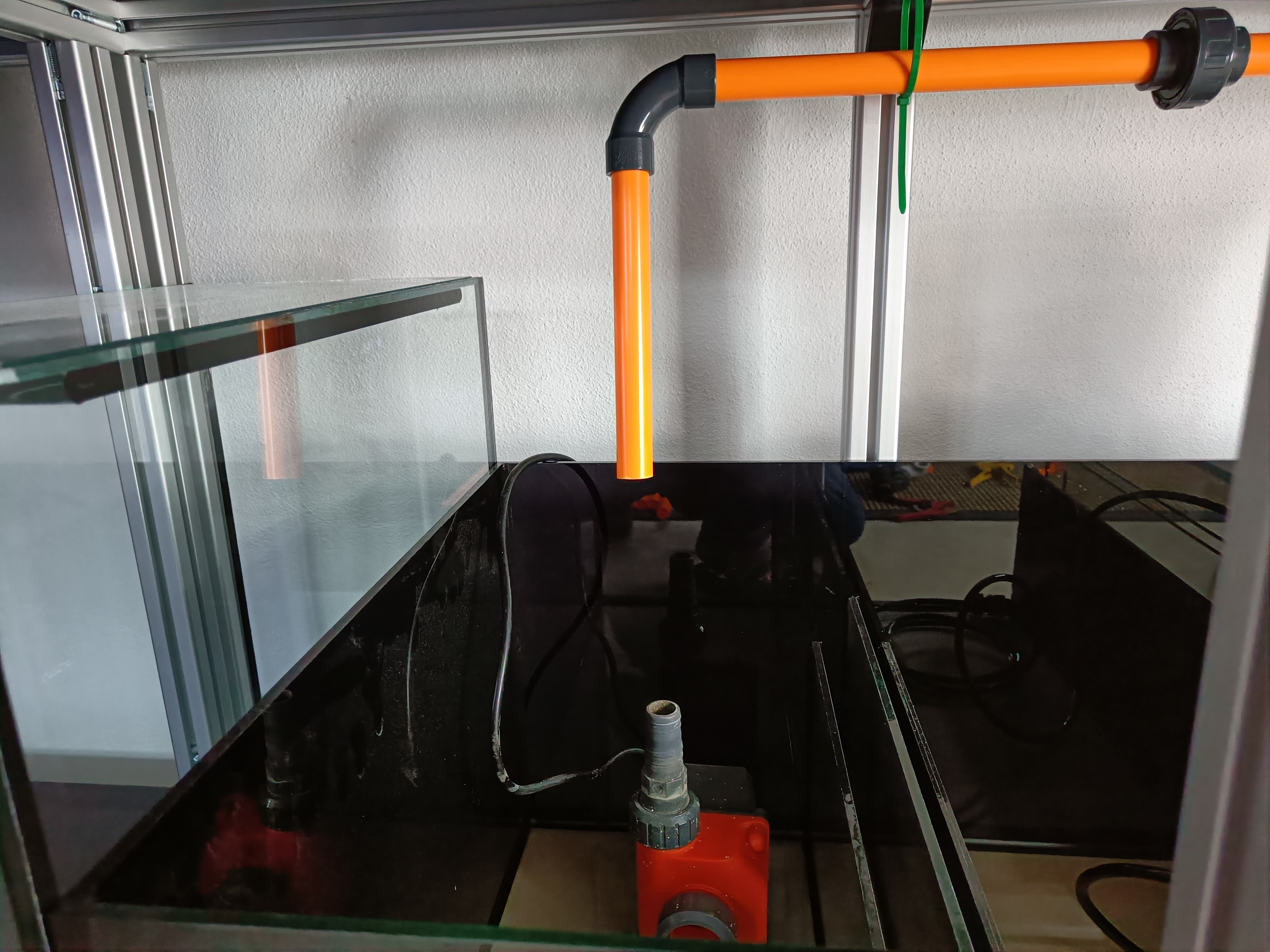 Jeg har i denne omgang fået monteret folie på bagside af display samt på sider og bagside af sumpen. Jeg mangler stadig at få monteret folie på osmose tank. Akvariet er blevet flyttet ind på plads, samt justeret så alt er i vatter, og der ingen spændinger skulle være i hverken akvarie eller sump.