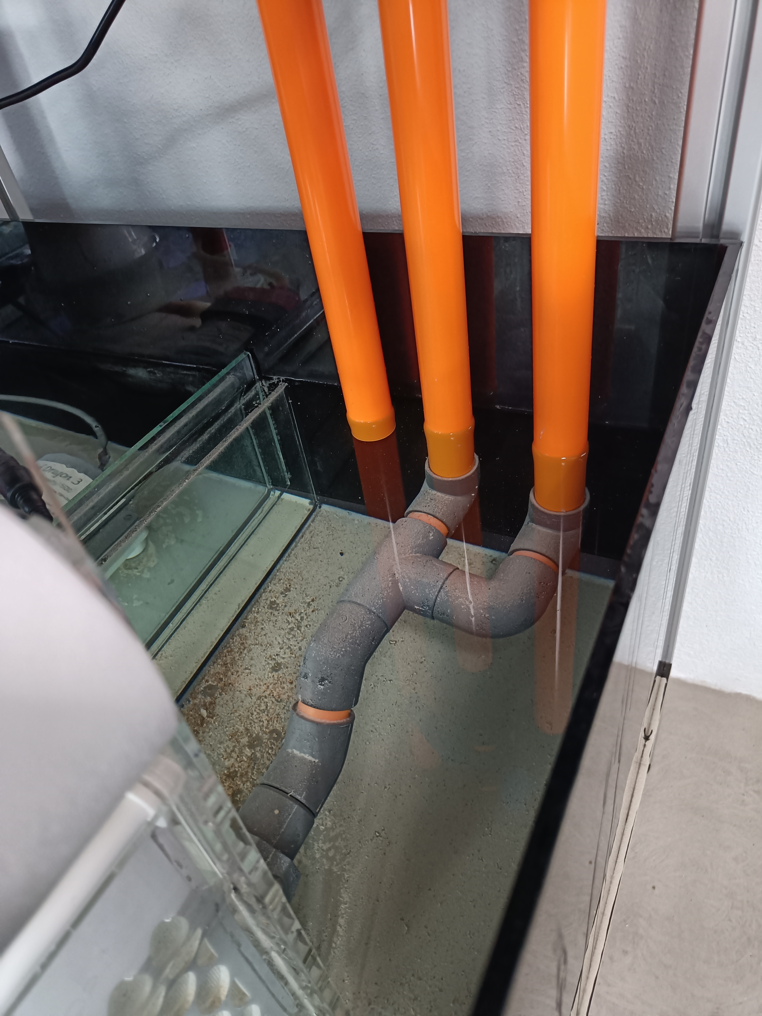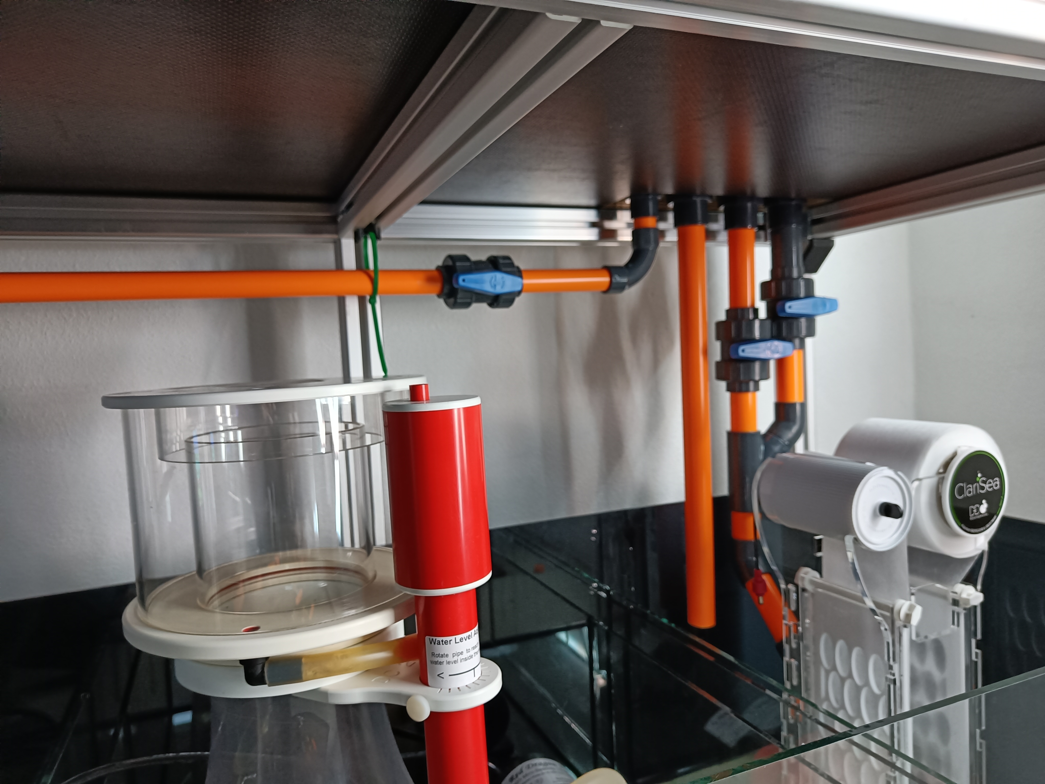 Af tanker i forbindelse med opstart af det hele, har Apex systemet skullet være et bærende element. For at kæle lidt for detaljerne har jeg derfor købt PVC rør i orange. I overløbet er der lavet 4 huller - 1 x 25mm (Retur) 3 x 32mm (Nedløb/durso samt sikkerhed) Jeg skal som sagt bruge et ClariSea rulle filter. Jeg har fået monteret nyt pvc på indløbet til filter. Jeg er gået med 2 haner på nedløb og durso, så alt kan justeres ind, så det er helt lydløst. I og med retur "kun'" er 25mm og nedløb er 32mm har jeg kørt disse to sammen, så alt vand render igennem rullefilter, i håb om at sumpen bliver forholdsvis ren. Jeg har valgt at gå med Royal Exclusive skummer som jo benytter sig af rød PVC rør. Tanken har strejfet mig selv at lave et nyt niveau rør, samt pakke luftindtaget ind i orange folie, bare så farven matcher