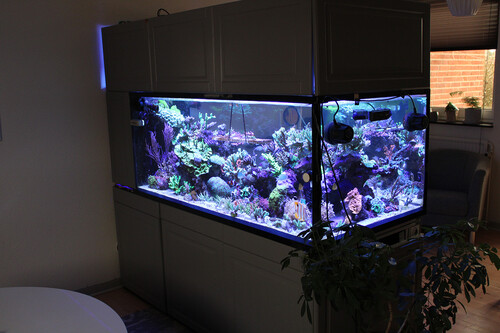 Det aktuelle akvarium, som er en rumdeler på (l)150x(b)80x(h)60(Vandsøjle er 55), så er på 720l, men med sten koraller osv. ca. 650l og er blevet bygget af vores berømte akvariebygger Bima, og bordet har jeg bygget af 40x40 aluminiums profiler, samt køkken låger fra Ikea, da de kan holde til saltvand pga. Deres maling.