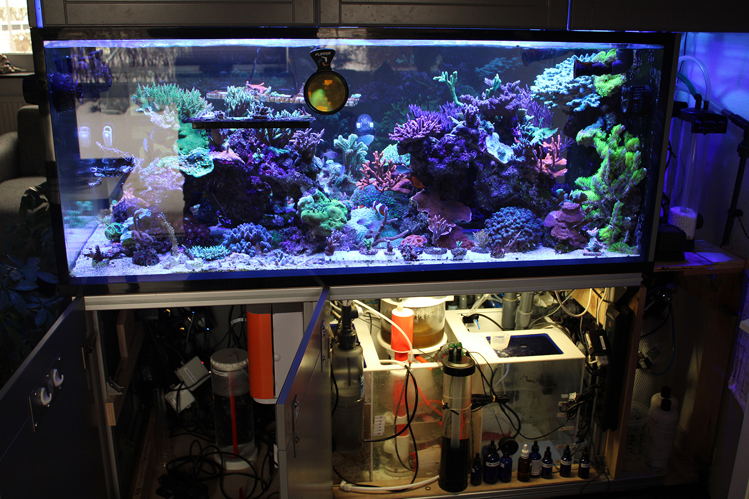 720 liter og 150 liters sump, Philips CoralCare gen 1 lamper, Nyos Quantum 220 skummer, MP40QD mobius og Jebao DCP10000 retur. Samt GHL profilux.
