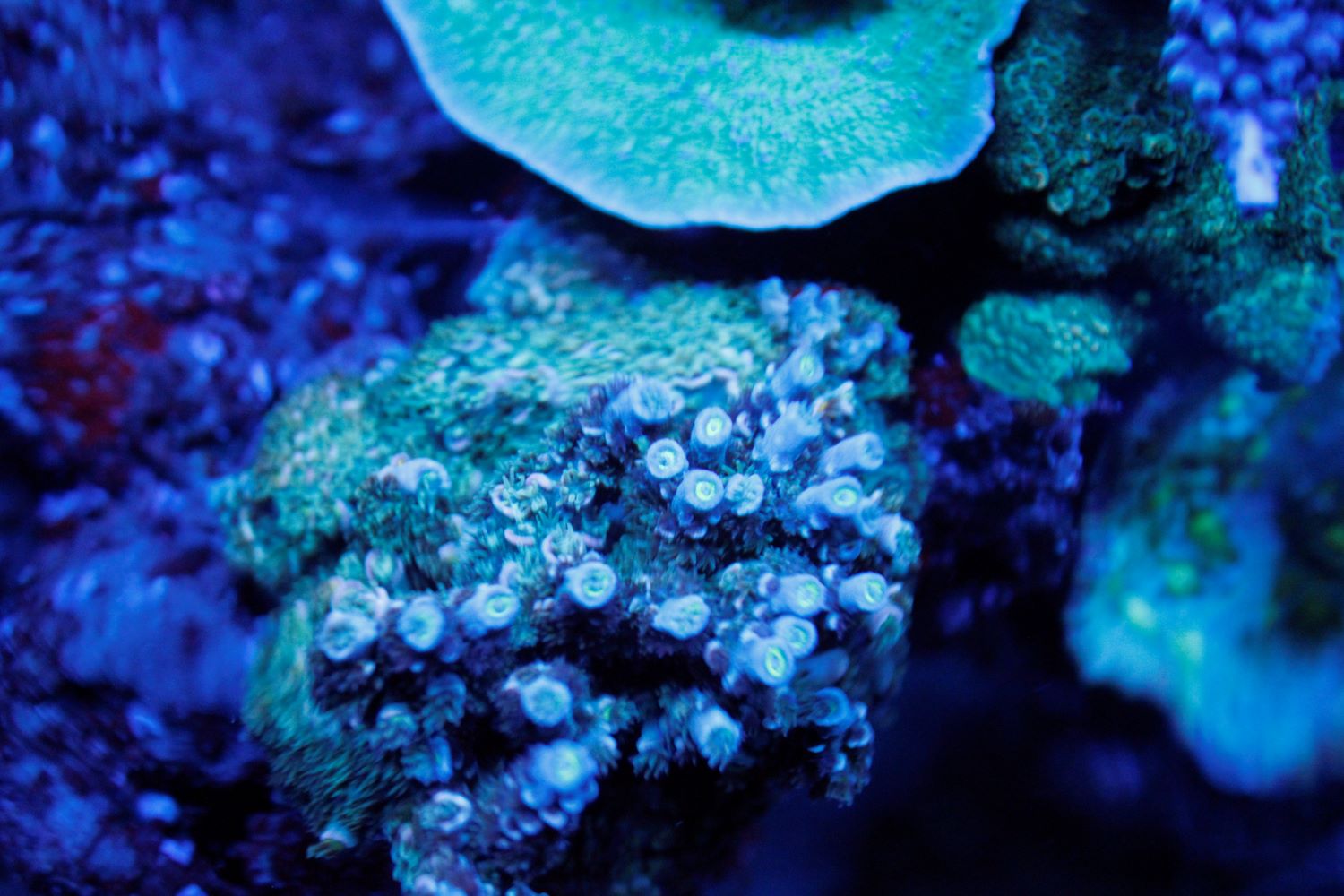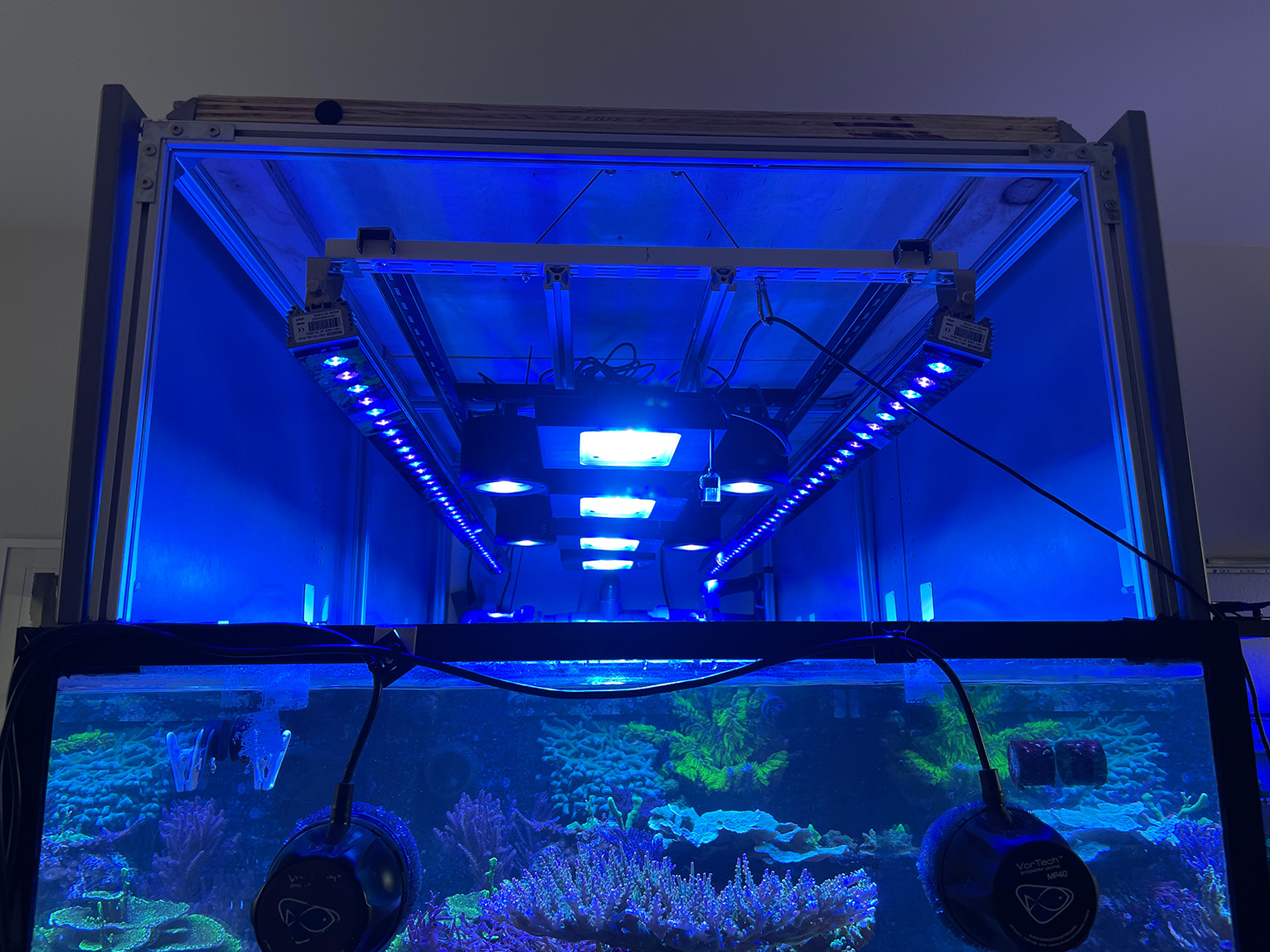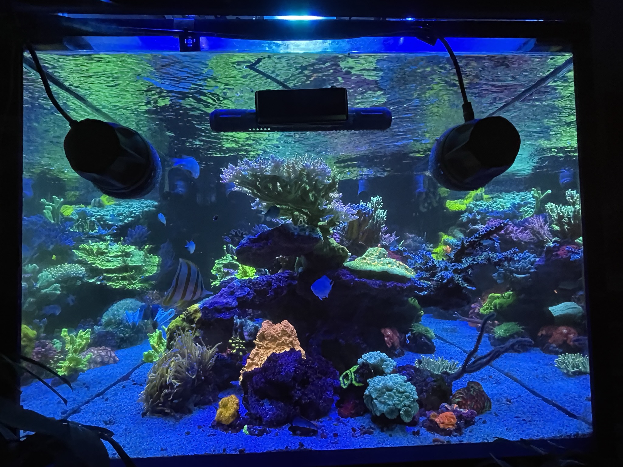 De virker som support lys, da XR15 kun dækker omkring 40x40cm med SPS, derudover er der 2 stk 1500mm Orphek OR3 Blue Sky.