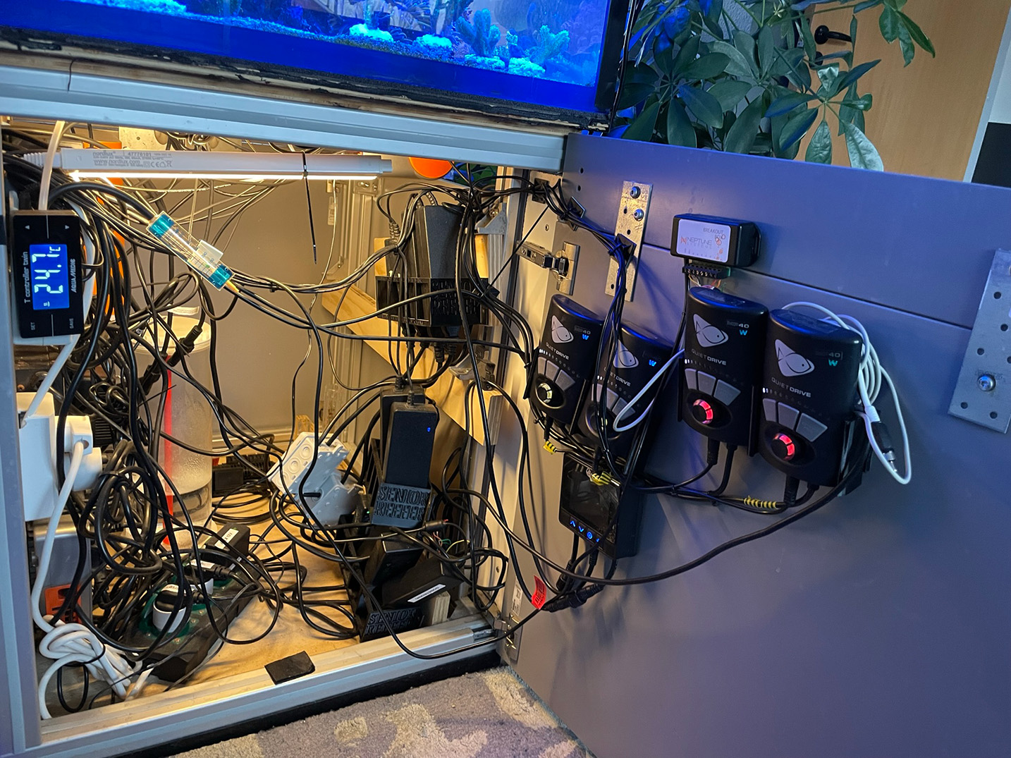 Jeg begyndte med et 128l akvastabil, senere 250 og til sidst 530, før en opgradering til et hjemmebygget i væg på 1400L. Jeg byggede det i vandfast krydsfiner, glasfiber med coat og målende var lidt specielle mål, på 160(L)*80(h)* (d) 122/75 (122cm på det dybeste sted med glasrude og diskokugle, som skulle give uendelig dybde)