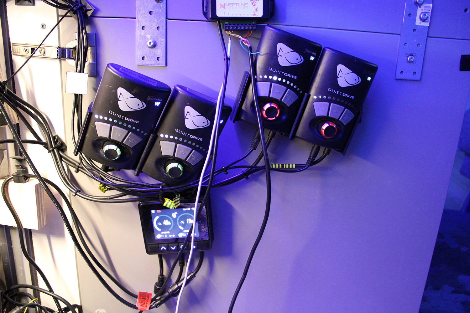 Der bruges PT 4 stk Ecotech Vortech MP40, fordelt med 2 i hver ende, for at skabe turbulent strømninger og hvirvelstrømme i overfladen. De kører alle reef crest (Simulere kraftige strømme på revet) på max 35% så omkring 50-70 gange turnover (omkring 40000-45000 l/t) af mit akvarie indhold. Derudover sidder der en Maxspect Gyre 330 i enden, som kører puls 0-100% hver 10 sec på 100%.